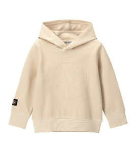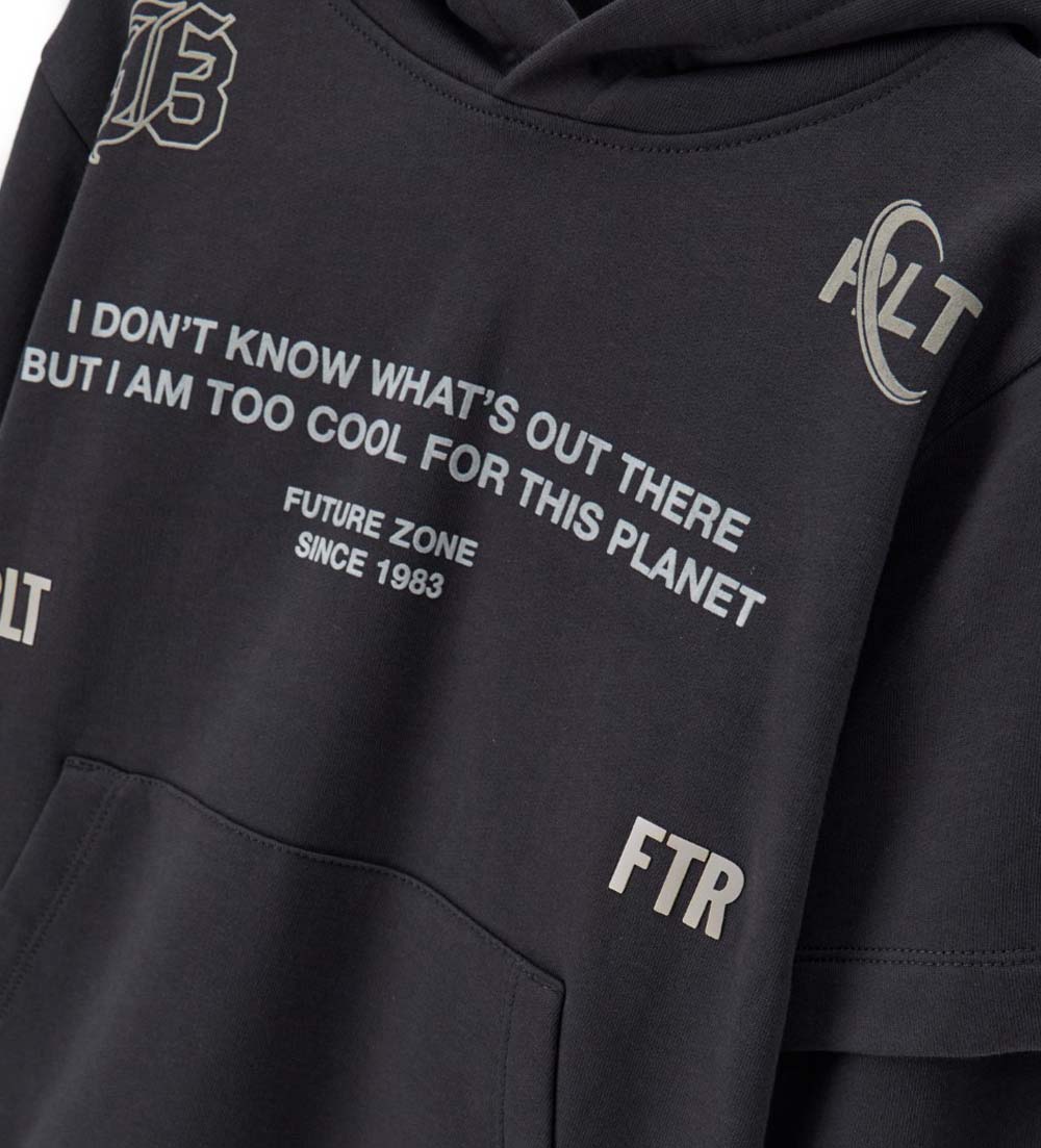 Sweat-shirt oversize en coton chaud, au style urbain. Manches longues à effet croisé, capuche doublée en coton, poche kangourou, finitions côtelées, imprimés et étiquette brodée.