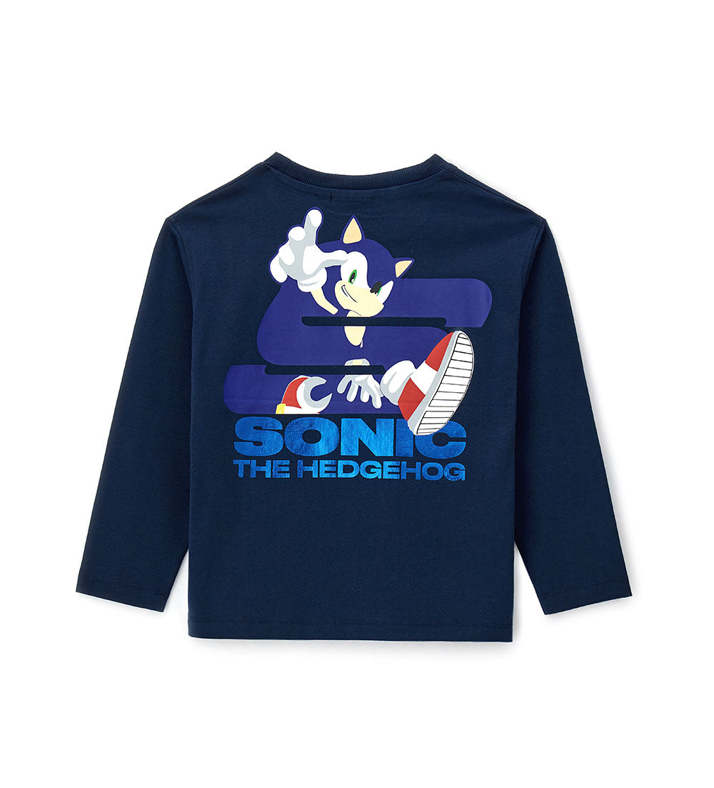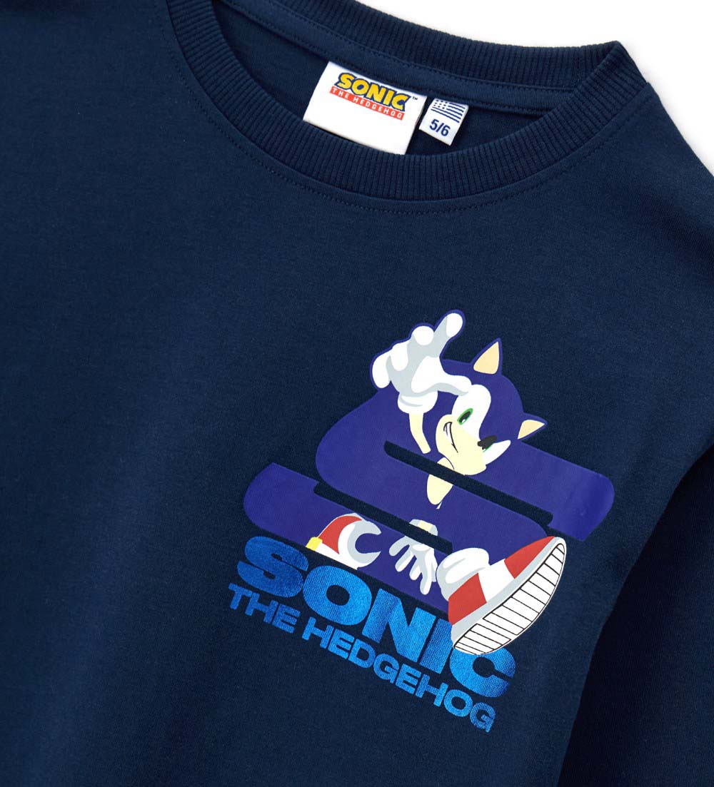 T-shirt Sonic à manches longues en coton chaud, col rond côtelé, imprimé devant/dos et détails métallisés pour un look confortable et ultra lumineux.