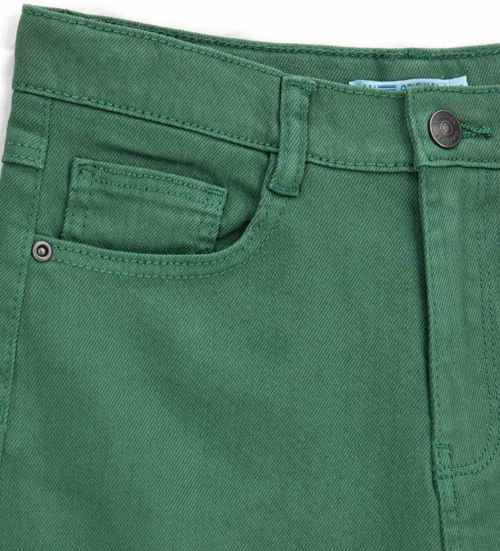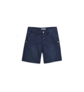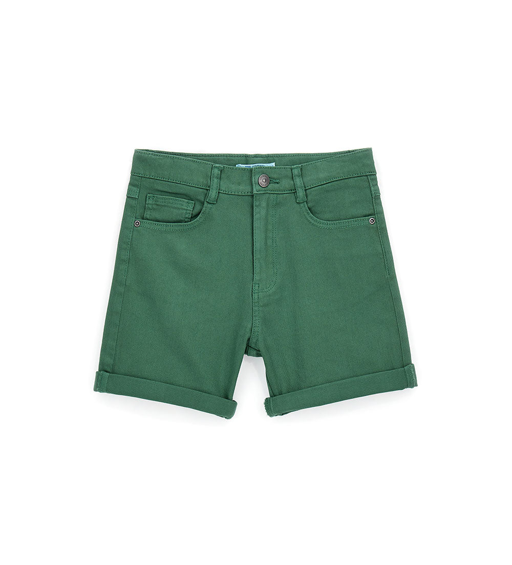 Bermuda en twill de coton stretch teint en pièce avec taille élastique réglable, ouverture boutonnée et zippée, poches avant et poches plaquées au dos et étiquette brodée sur la poche arrière.