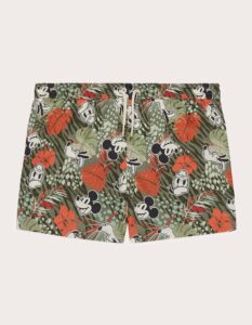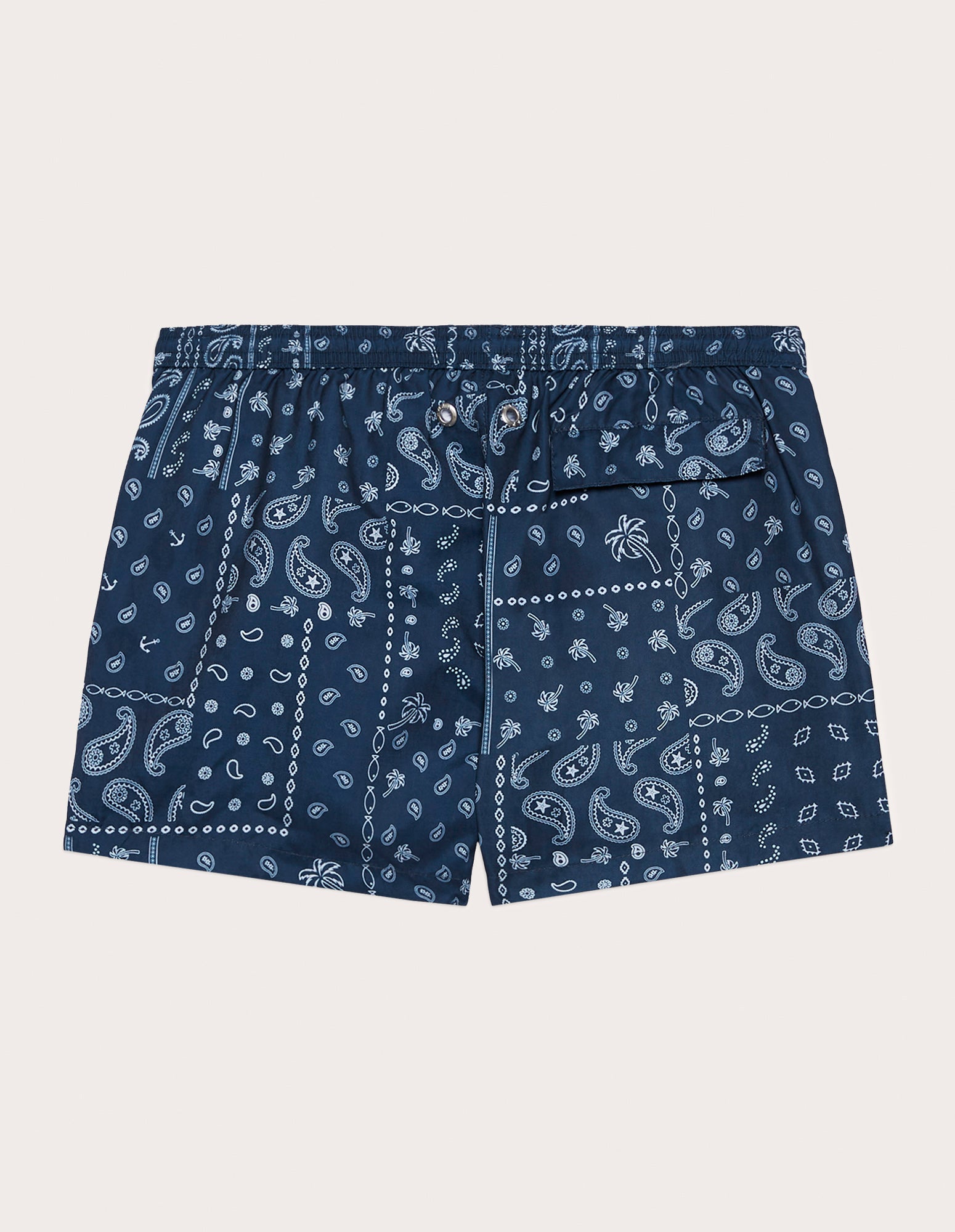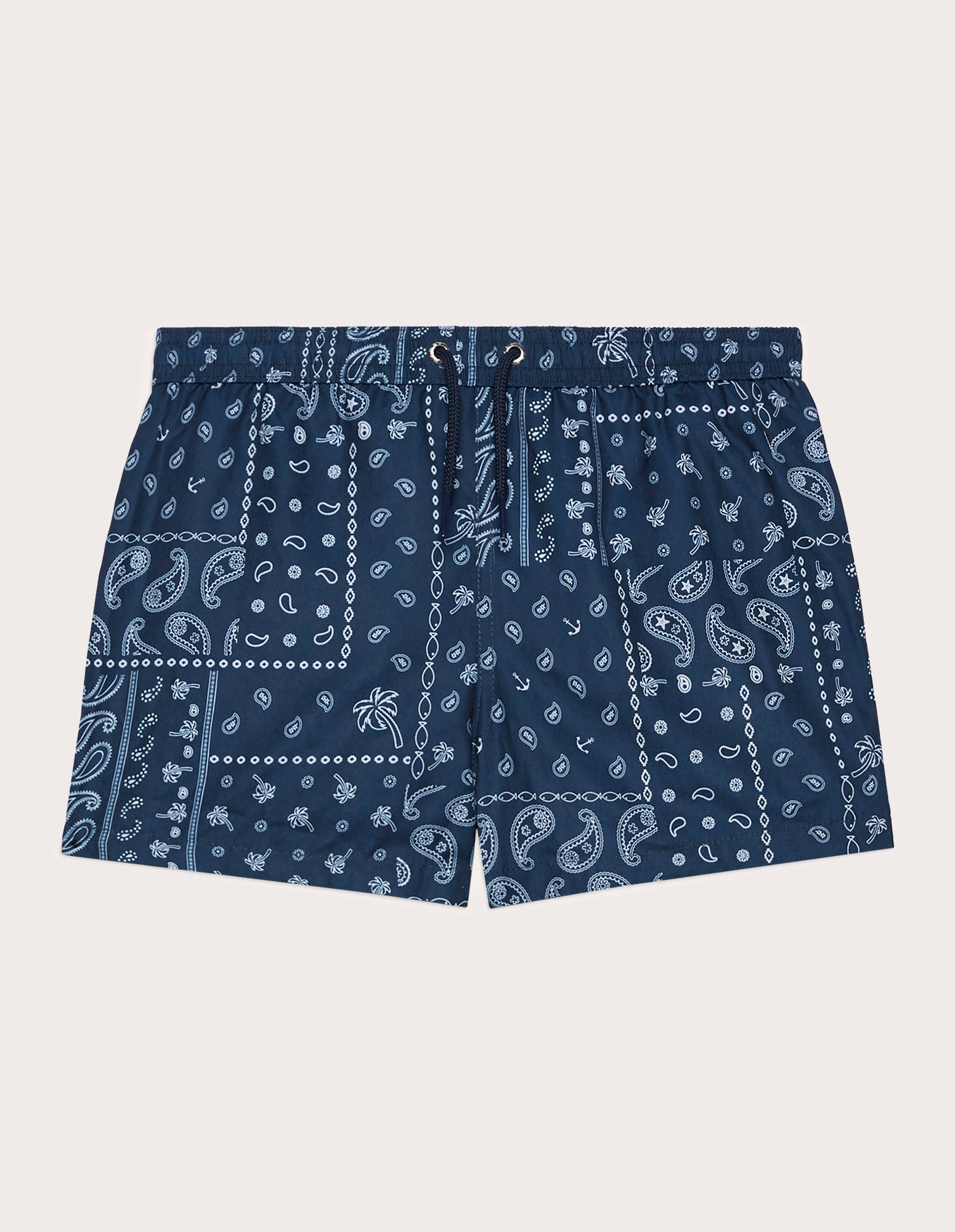 Boxer de bain mi-long pour garçon, en tissu léger à séchage rapide. Imprimé dans des tons bleus effet cachemire. Taille élastique avec cordon de serrage réglable et poche arrière.