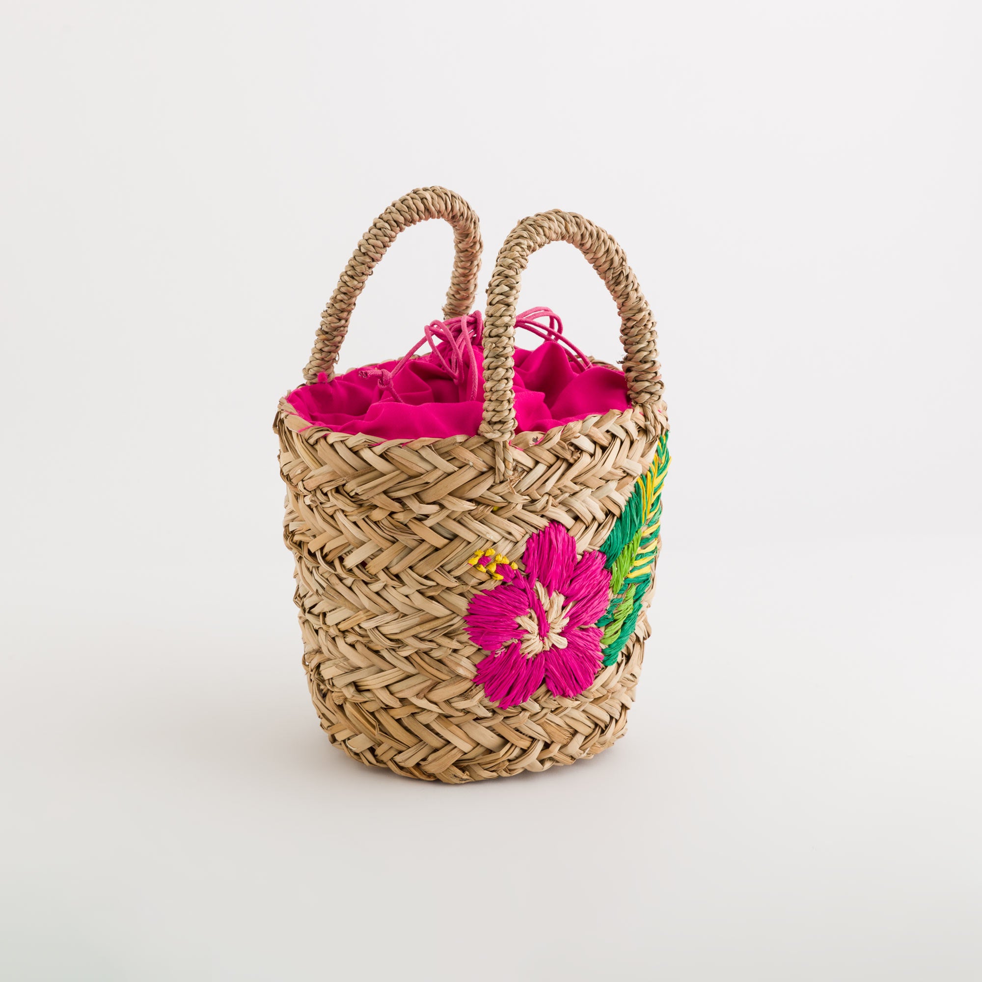 Petit panier de la collection Amorgos de Carpisa, confectionné en paille avec une broderie florale en raphia, un savoir-faire exquis. Il est doté d’un cordon de serrage et de poignées.