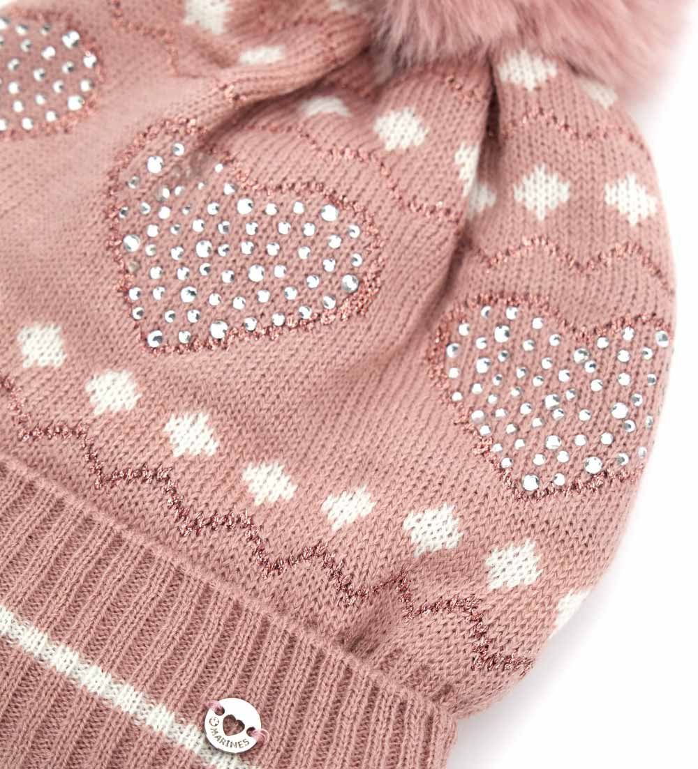 Bonnet tricoté avec motif jacquard coeur, strass avec pompon en fourrure et doublure polaire.