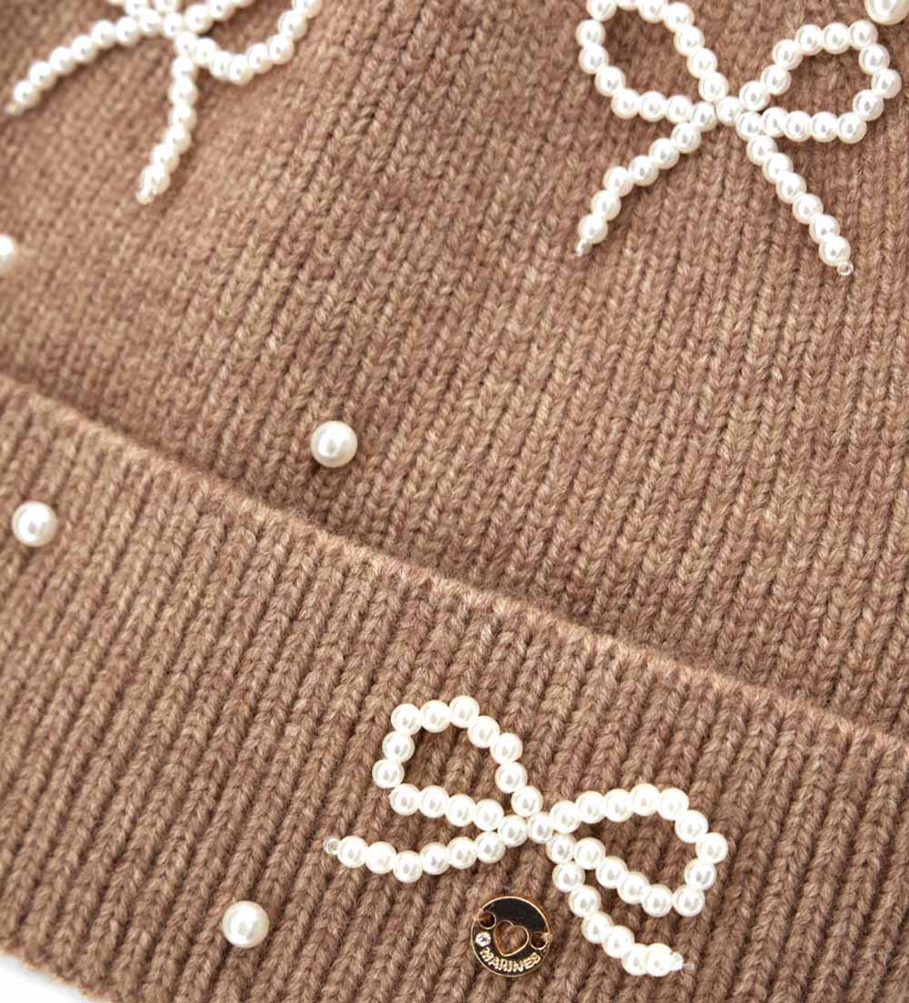 Bonnet en tricot avec revers et décorations, idéal pour ajouter une touche de style aux looks d’hiver.