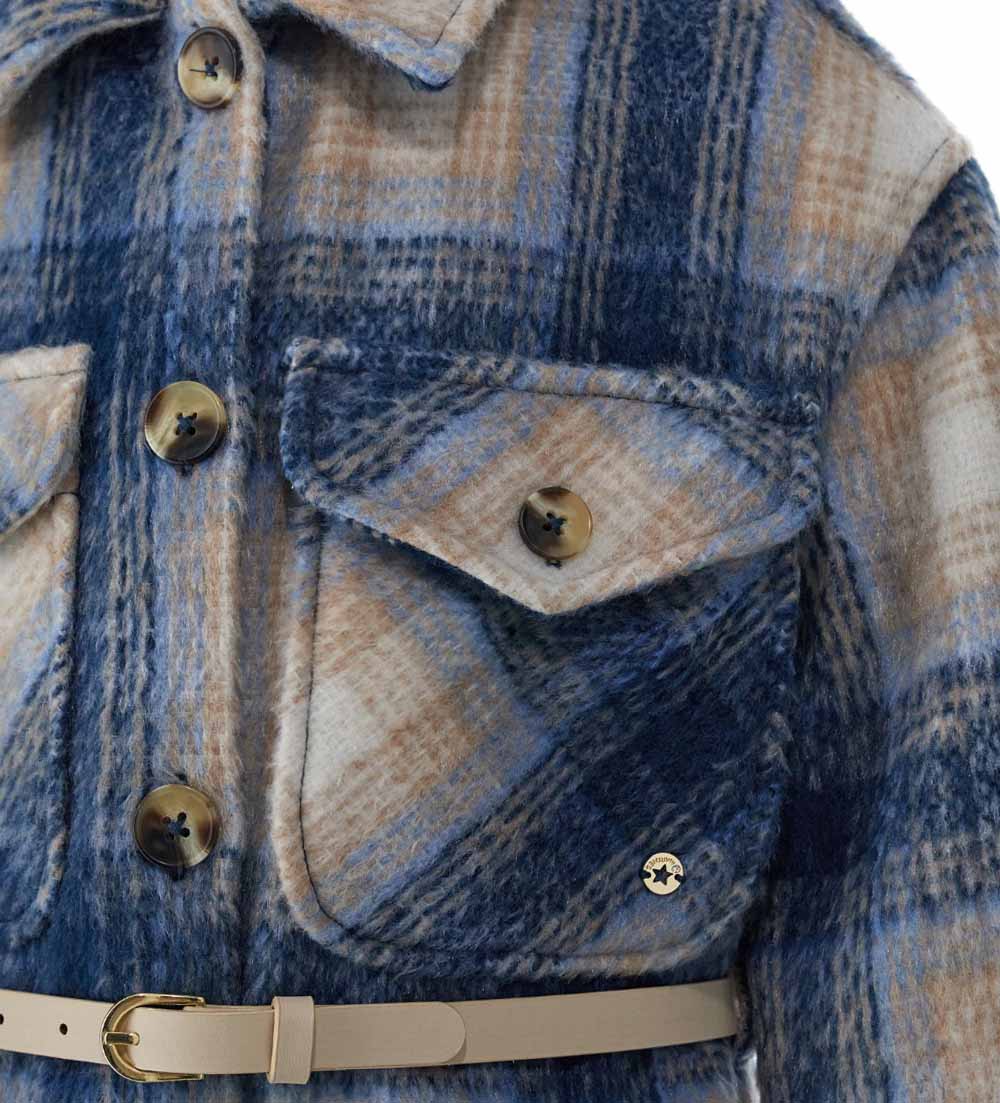 Chemise à carreaux décontractée et contemporaine avec col classique, boutonnage sur le devant, ceinture amovible et breloques logo en métal doré.