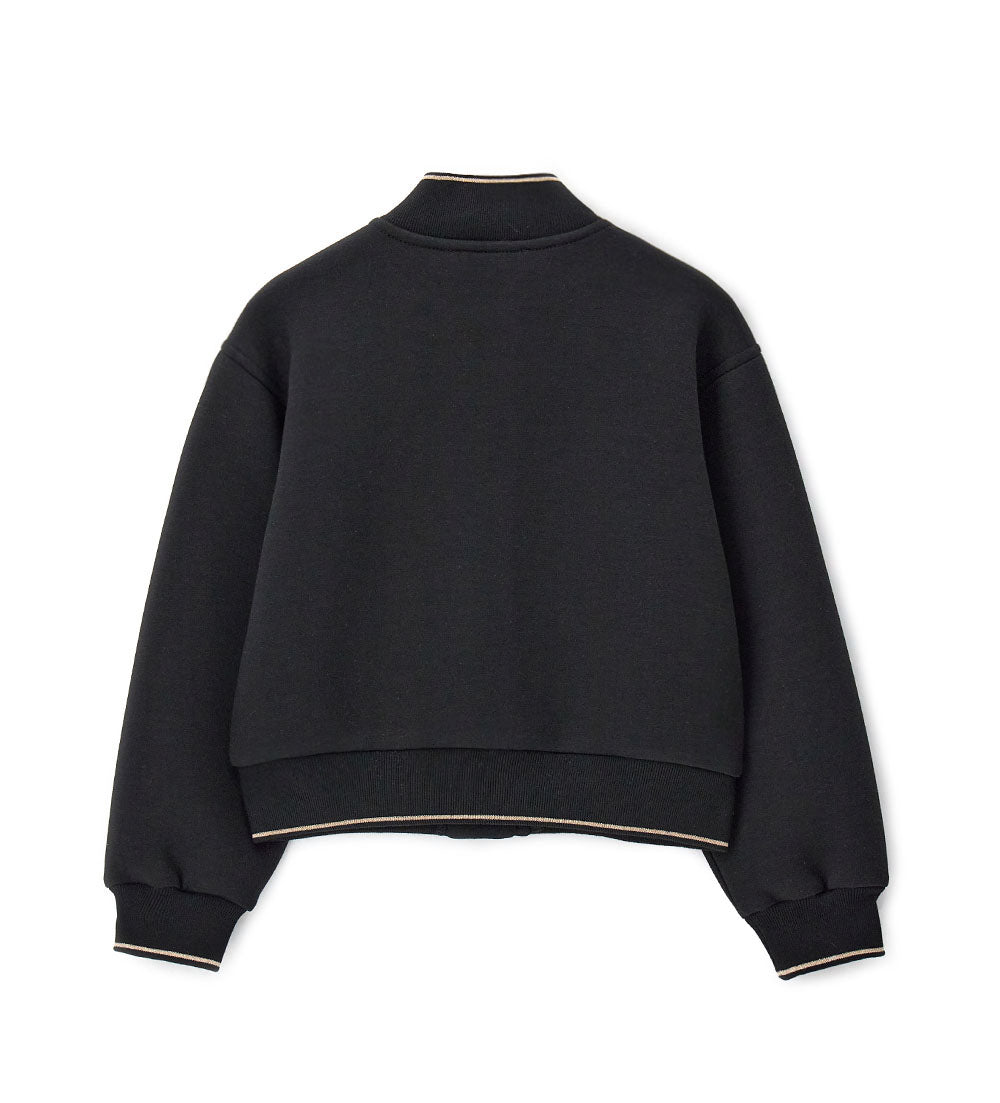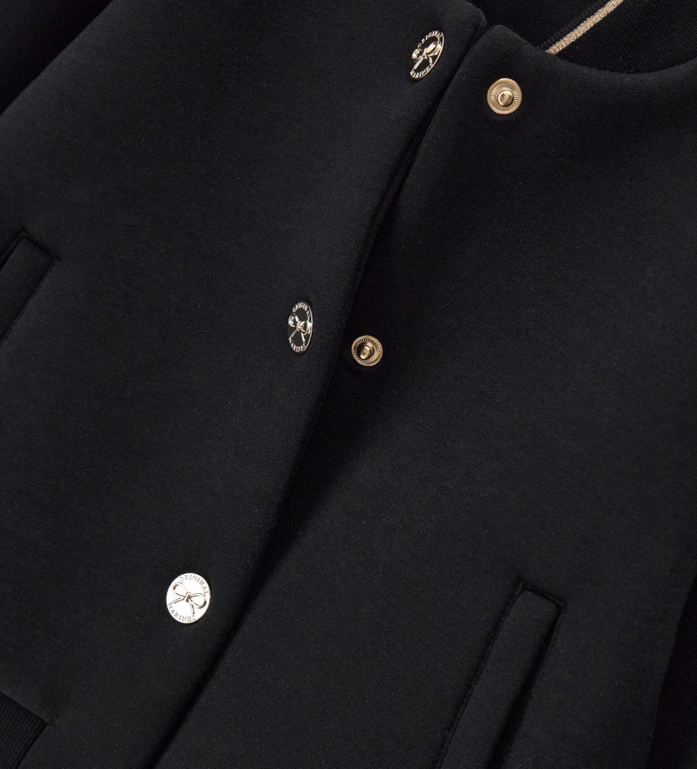 Veste de plongée à col rond et finitions côtelées. Ouverture sur le devant par boutons-pression, manches longues à ourlet côtelé et poches ornées d’un nœud en tissu pour un look chic et tendance.