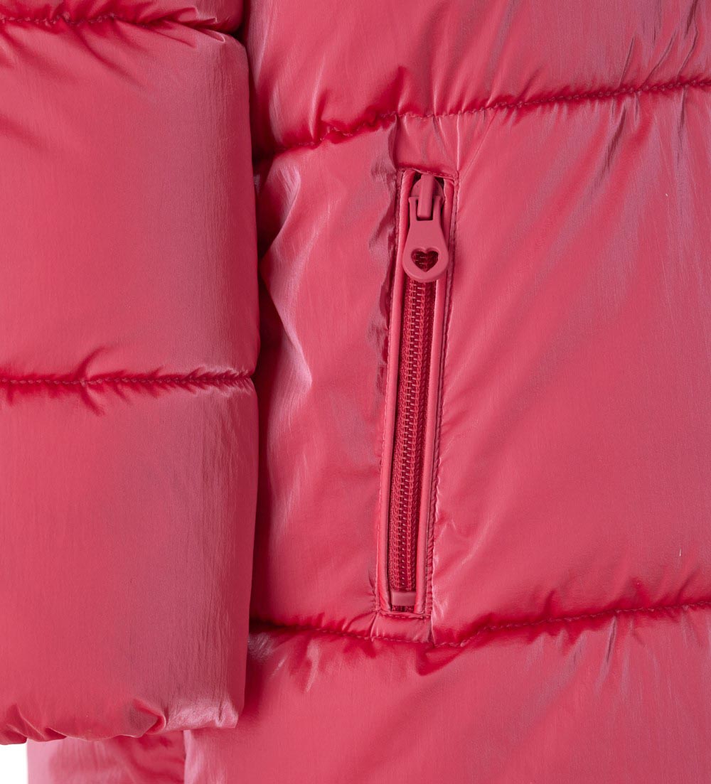 Veste matelassée en nylon brillant avec capuche et manches longues à élastique intérieur. Doublure en chenille assortie, fermeture éclair, poches avant et patch logo strass pour un style élégant et tendance.