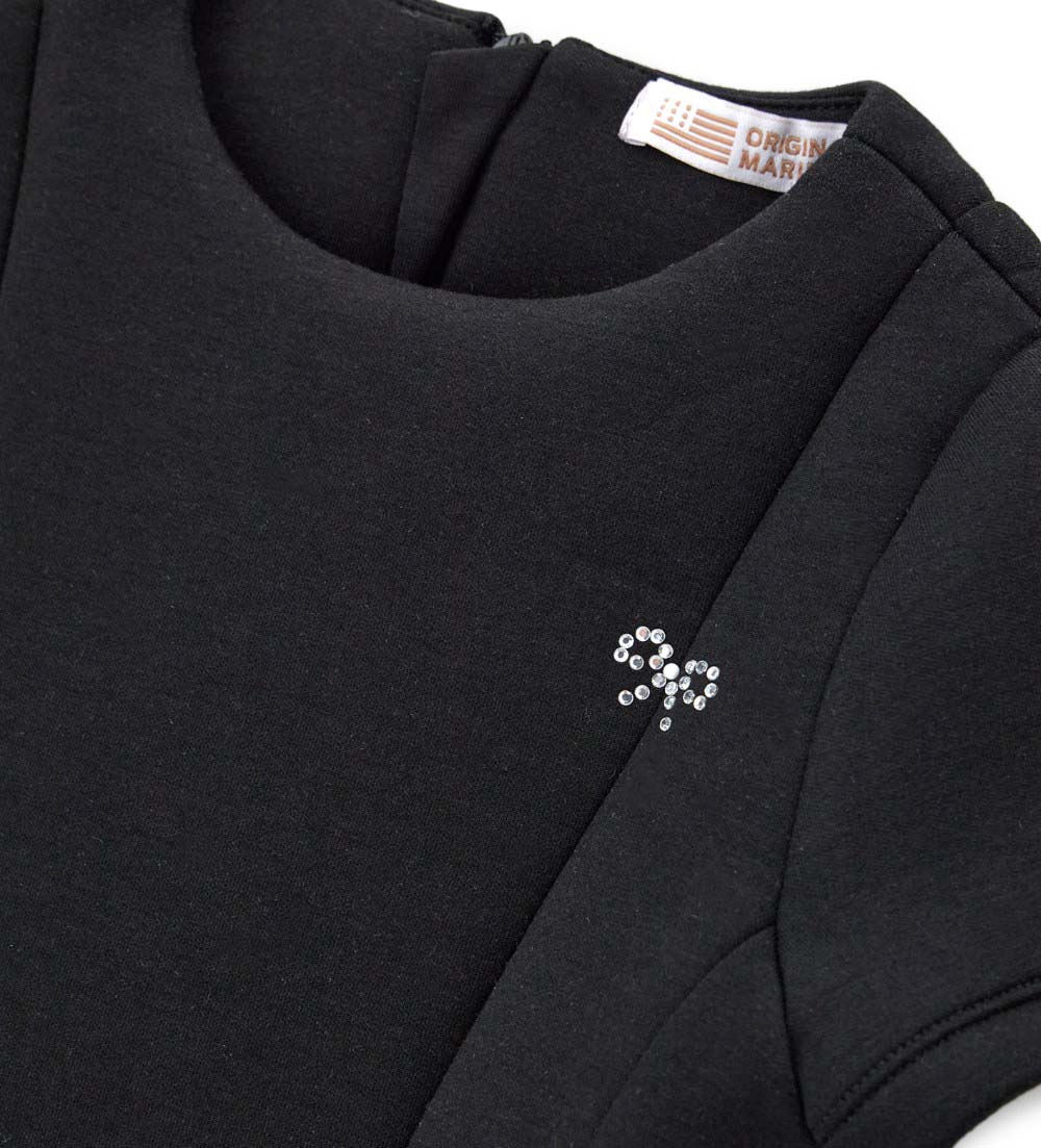 Robe de plongée à col rond et fermeture éclair invisible au dos. Manches courtes et strass sur le devant et le côté cœur pour un look chic et lumineux.