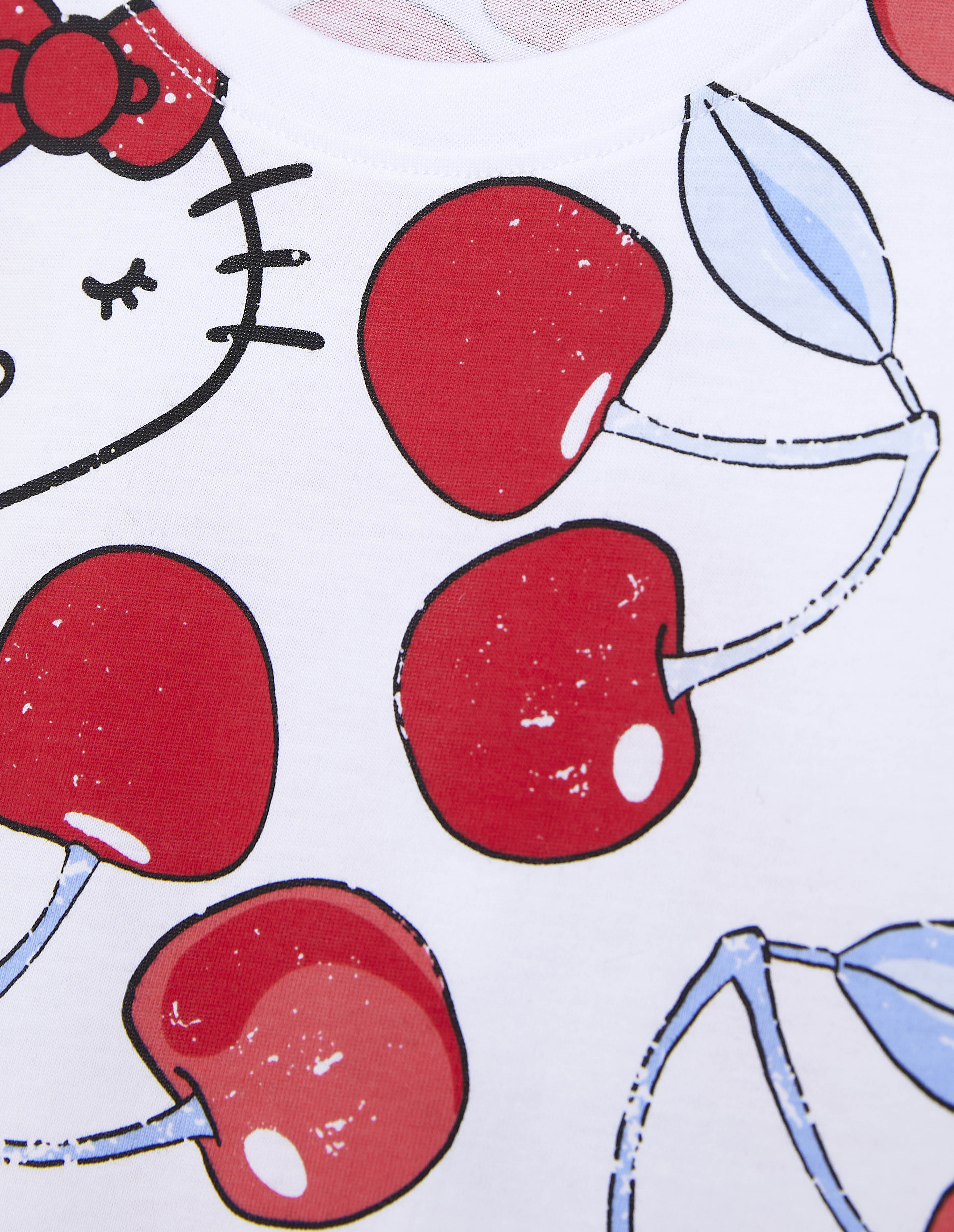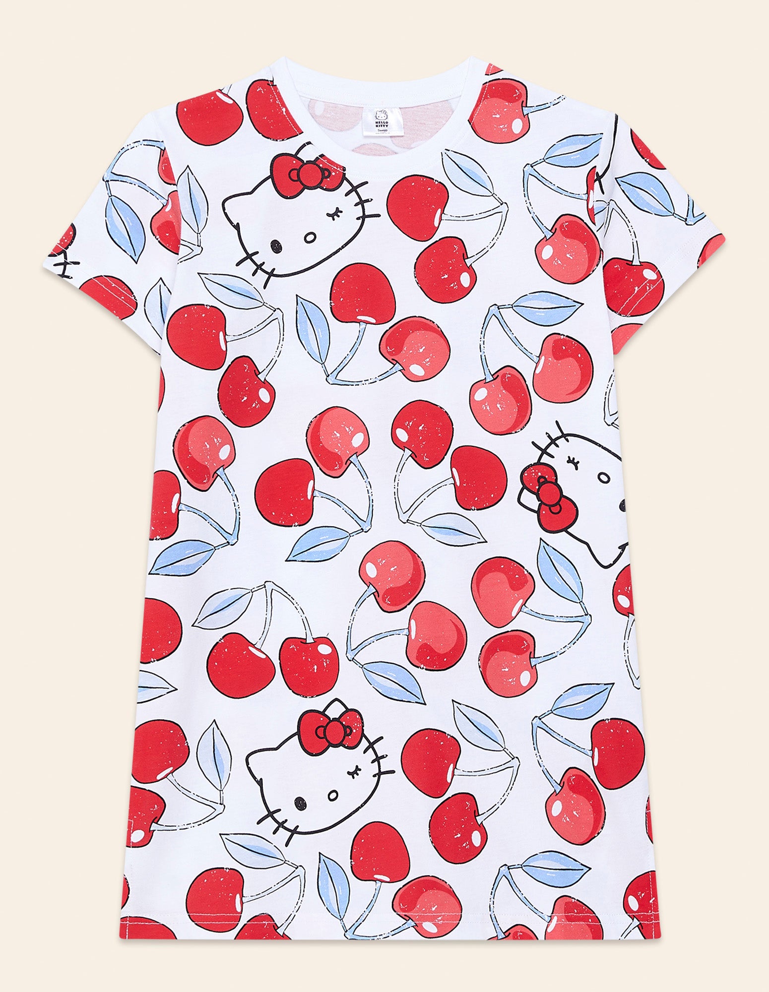 Chemise de nuit courte pour fille en jersey de coton léger, ornée d’un imprimé Hello Kitty et de cerises rouges sur fond blanc. Ce modèle présente une coupe droite et décontractée, des manches courtes et une encolure ronde classique rehaussée d’une bordure assortie.