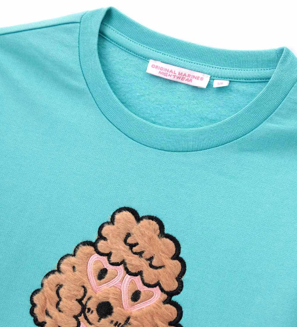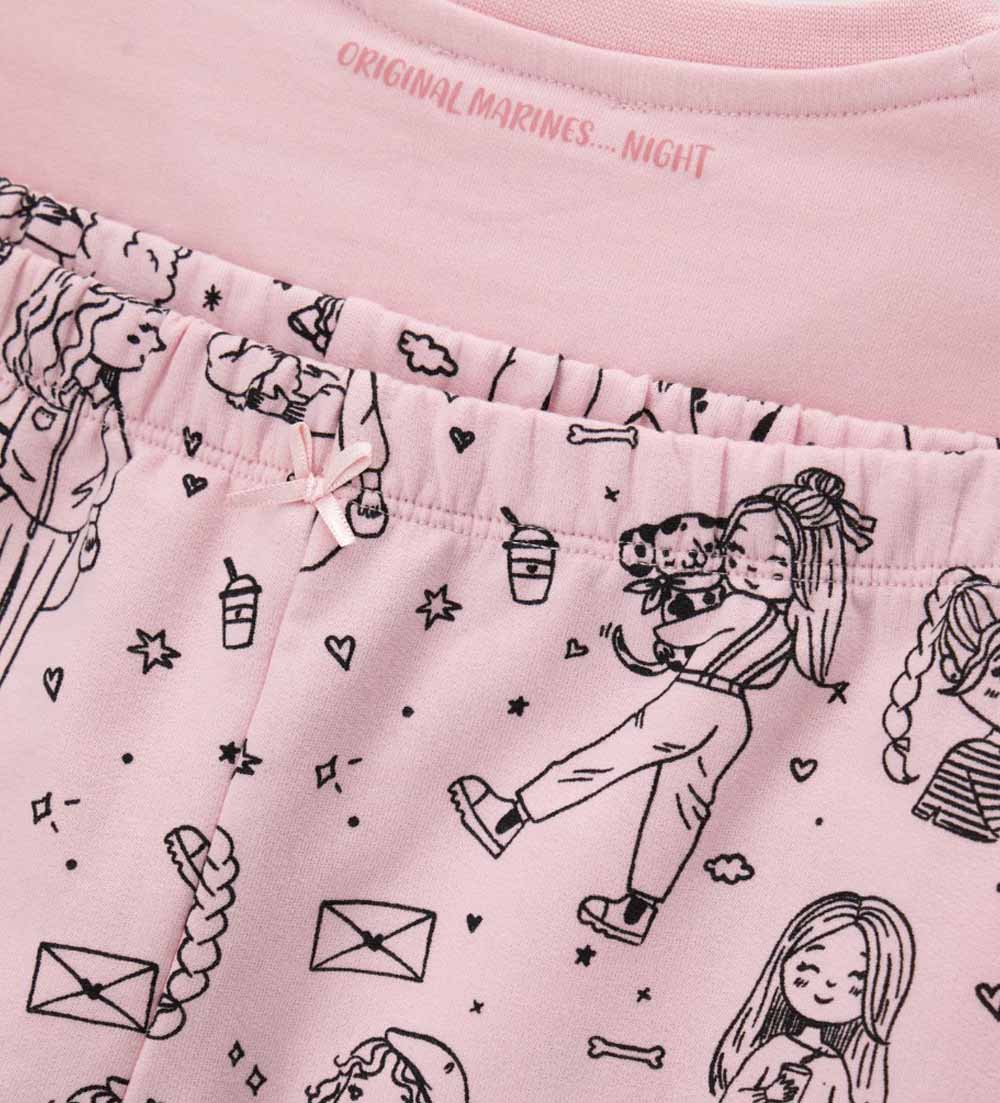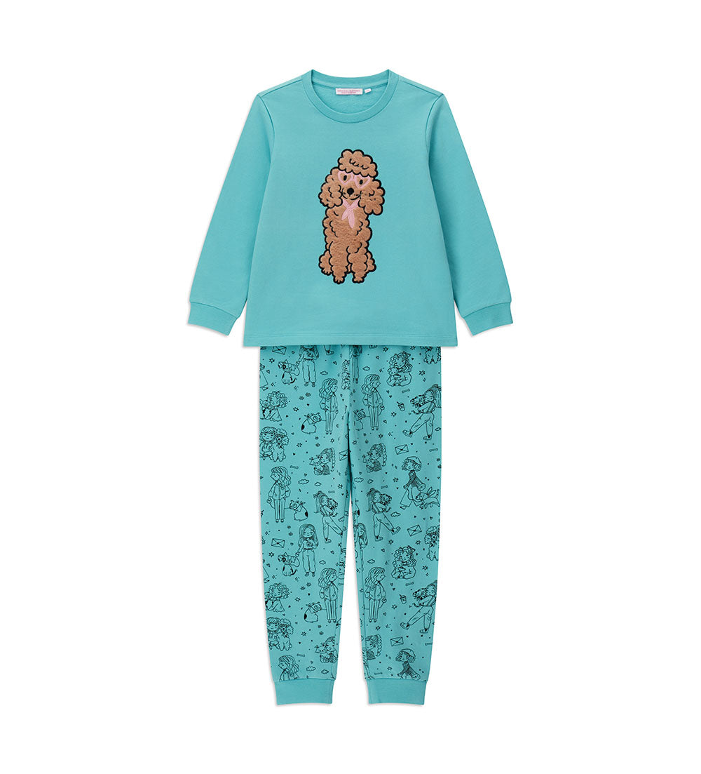 Pyjama en molleton de coton composé d’un t-shirt col rond, d’une application de fourrure et d’un bord-côte. Pantalon à imprimé all-over, bord-côte et nœud.