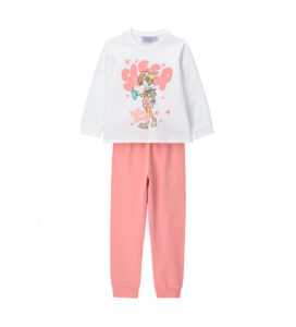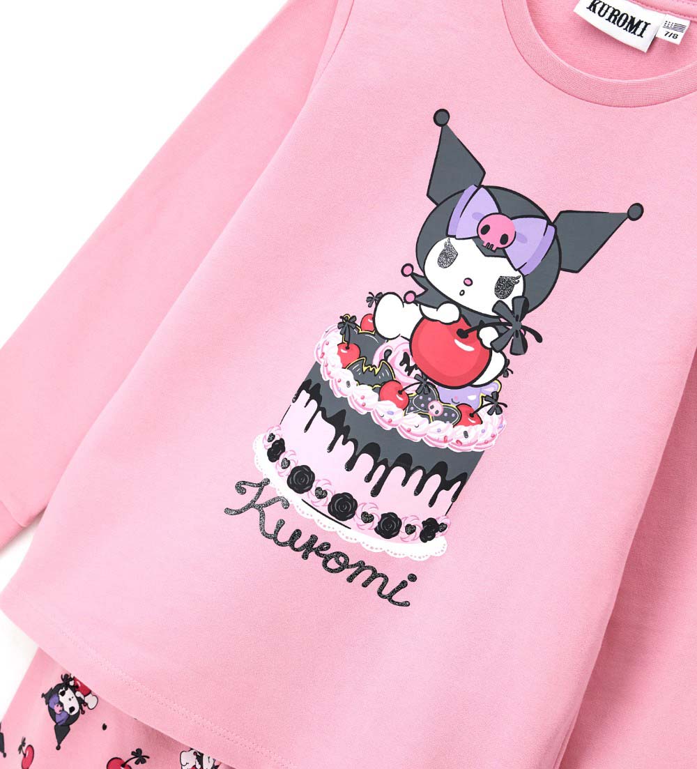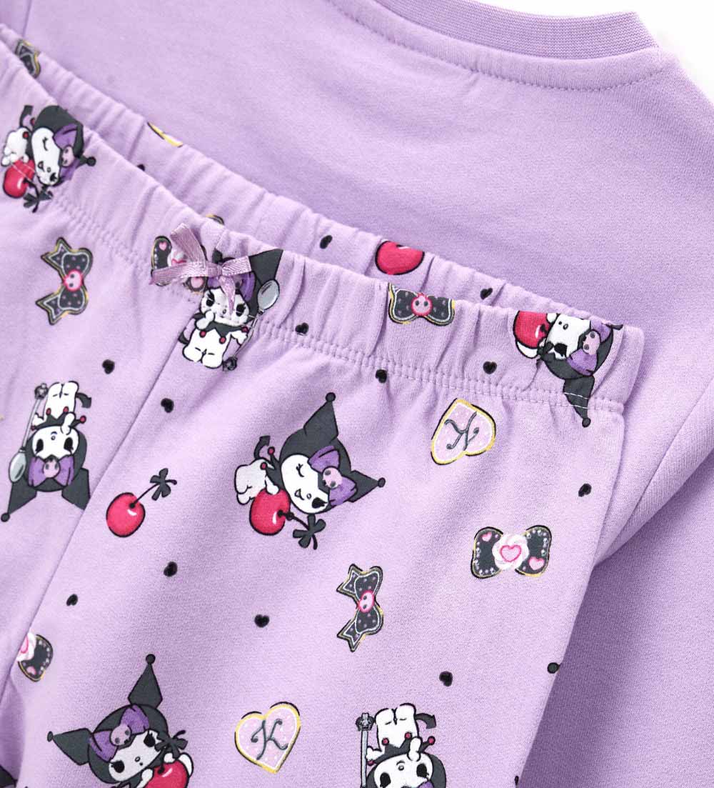 Pyjama imprimé Hello Kitty Kuromi en molleton de coton avec t-shirt col rond, imprimé et bordures côtelées et pantalon côtelé assorti avec imprimé all-over et nœud.