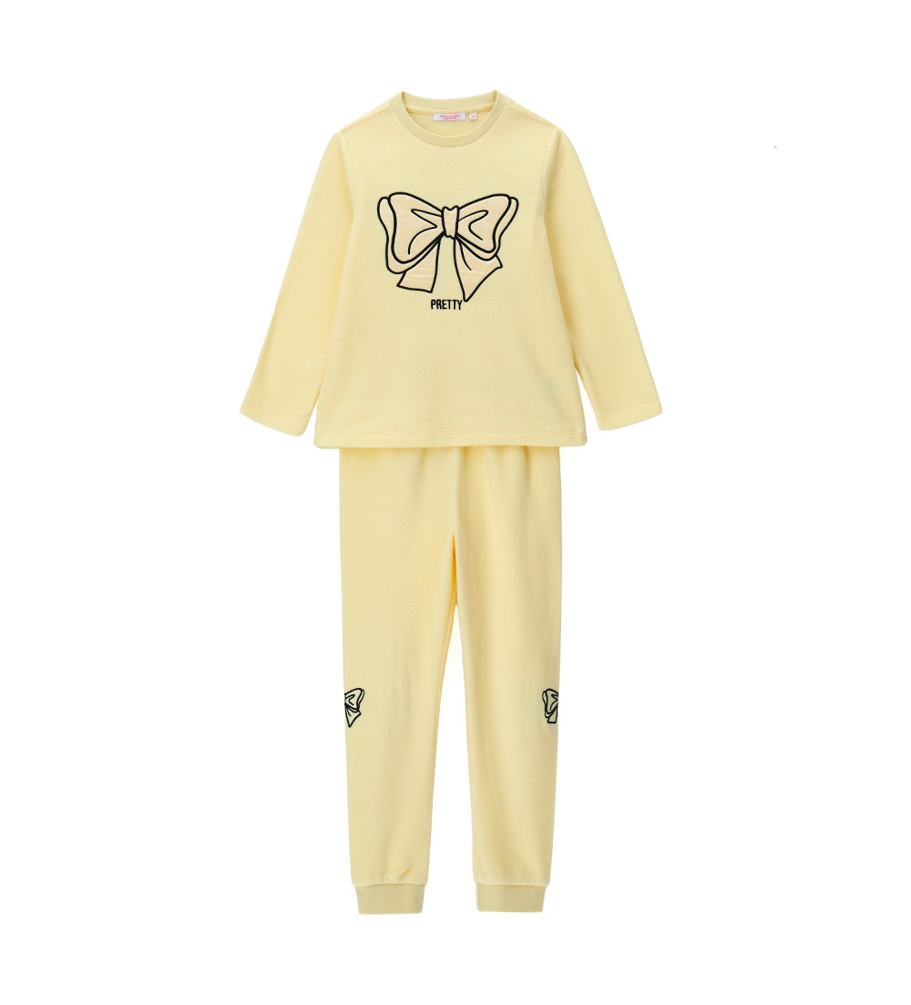Pyjama en polaire composé d’un t-shirt col rond orné d’appliqués et de broderies, et de finitions côtelées. Pantalon assorti orné de broderies, de finitions côtelées et d’un nœud.