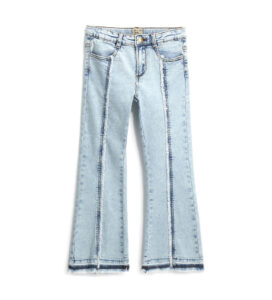 Pantalon en denim doux avec ourlet effiloché et ceinture élastique réglable et surpiqûres contrastées.