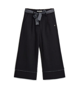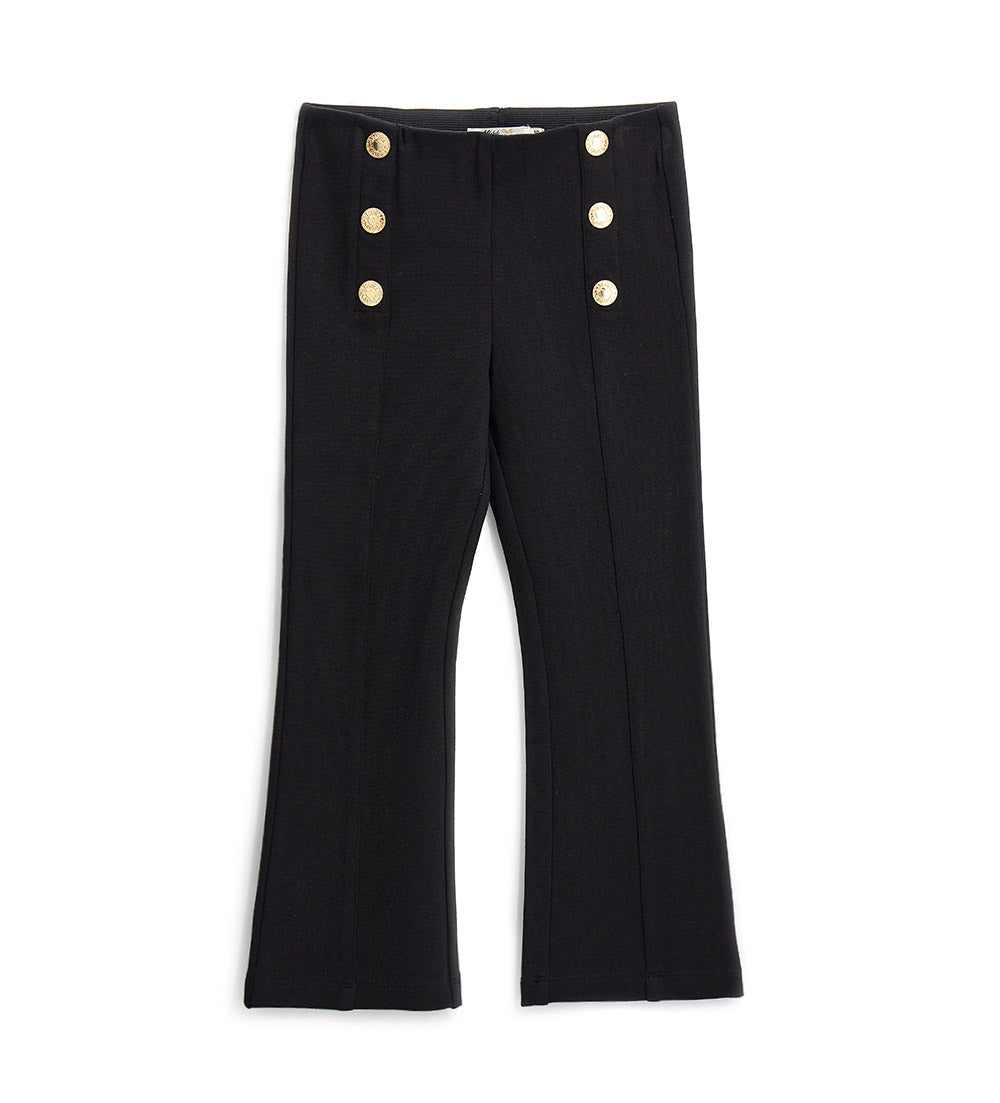 Pantalon long en tissu surpiqué avec taille élastiquée et boutons décoratifs sur le devant.