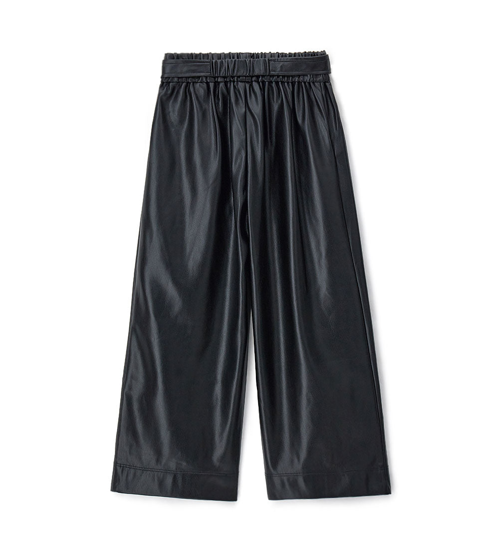 Pantalon en similicuir avec taille élastiquée et poches avant. Jambes larges et ceinture amovible à boucle métallique pour un look moderne, audacieux et ultra-stylé.