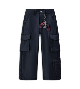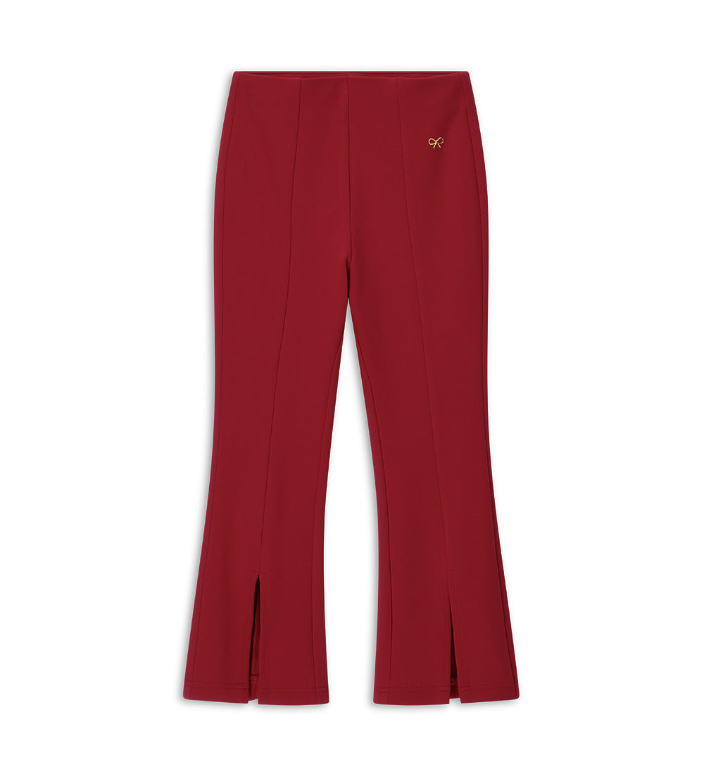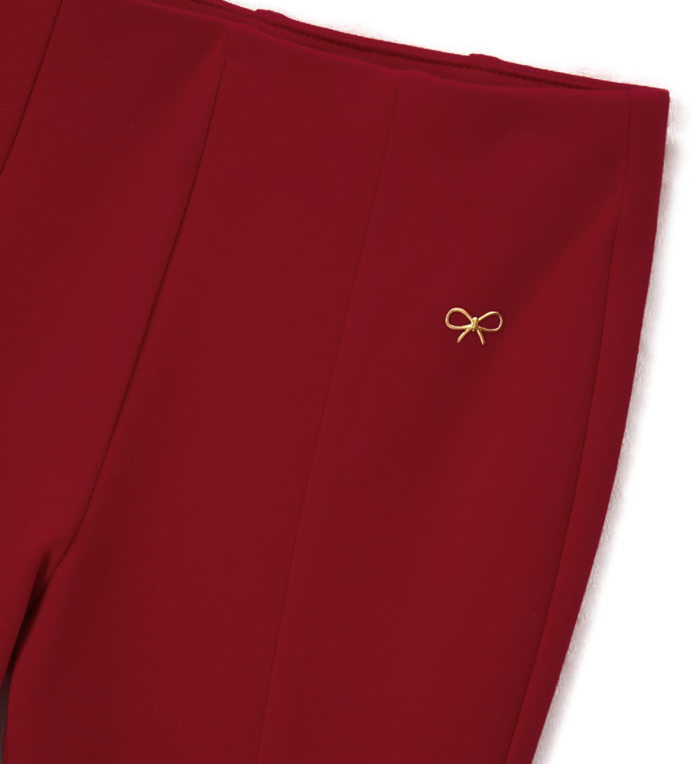 Pantalon en maille Milano extensible, taille haute, plis et fente en bas. Personnalisé avec un imprimé métallisé sur le devant, il est parfait en toute occasion.