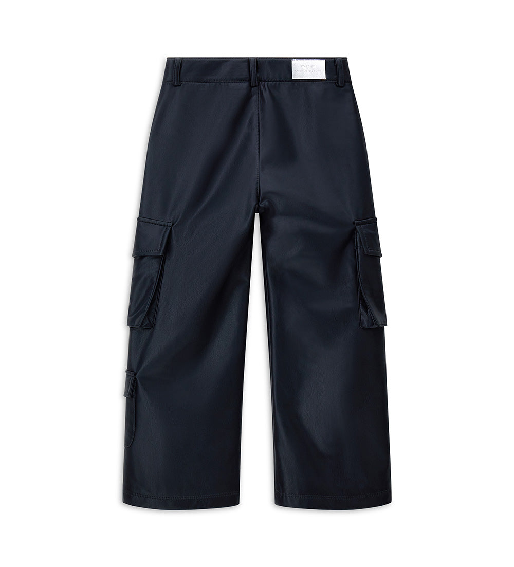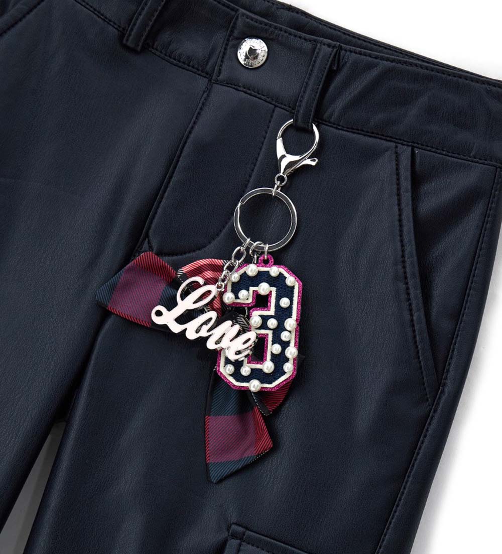 Pantalon en simili cuir à taille ajustable avec breloques amovibles, ouverture devant et poches, patch décoratif au dos.