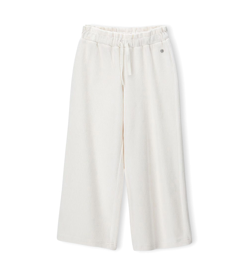 Pantalon en velours côtelé avec taille élastiquée et cordon de serrage pour un ajustement parfait. Breloques logo en métal argenté, idéales pour toutes les occasions.