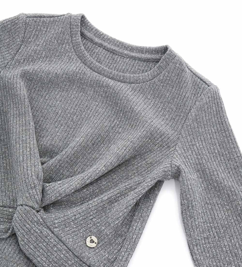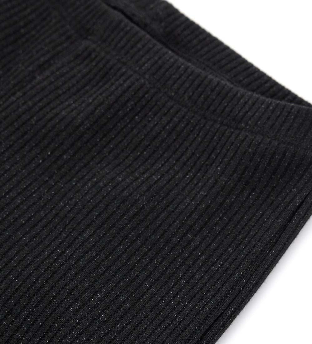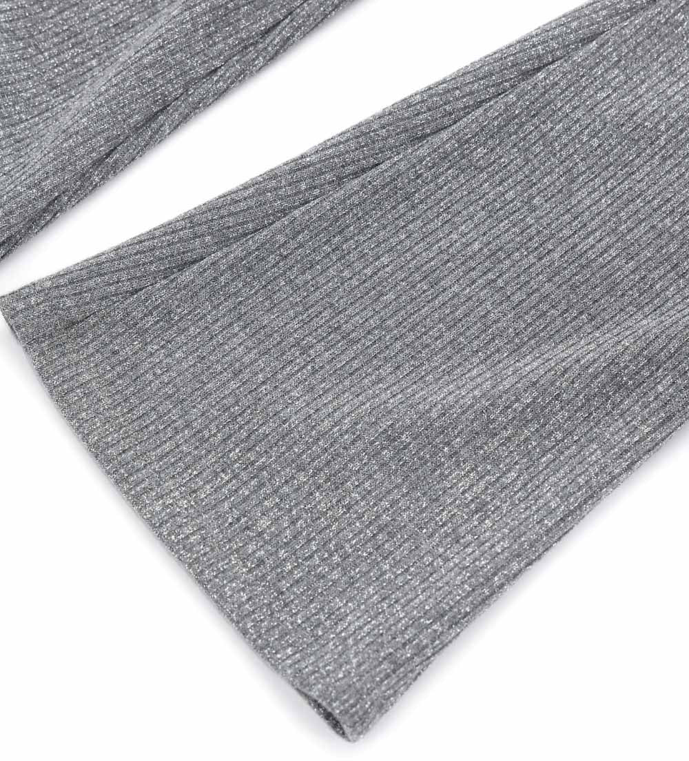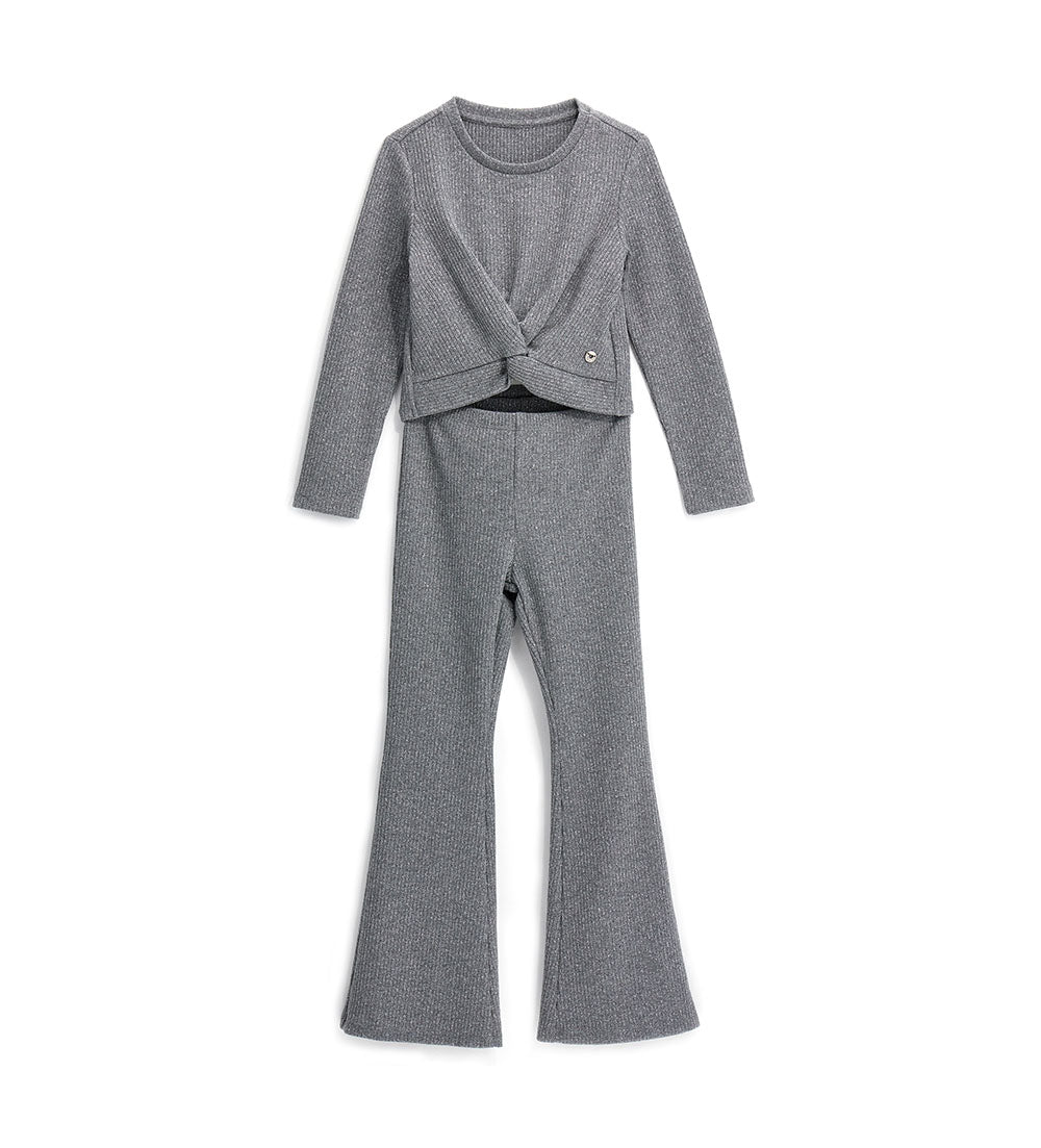 Combinaison camionneur côtelée avec touches de lumière : t-shirt court avec devant croisé et pantalon patte d’éléphant avec taille élastique.