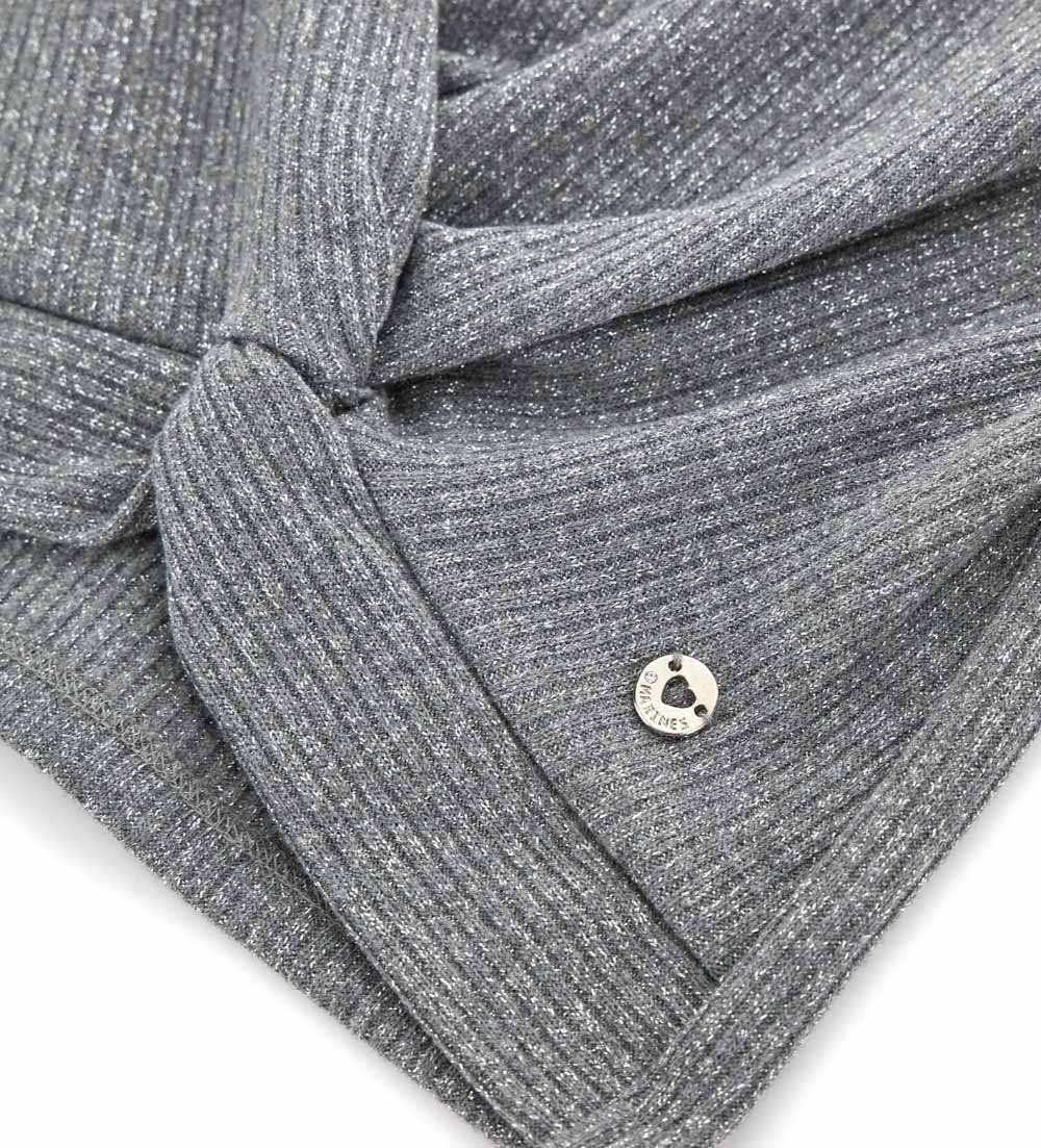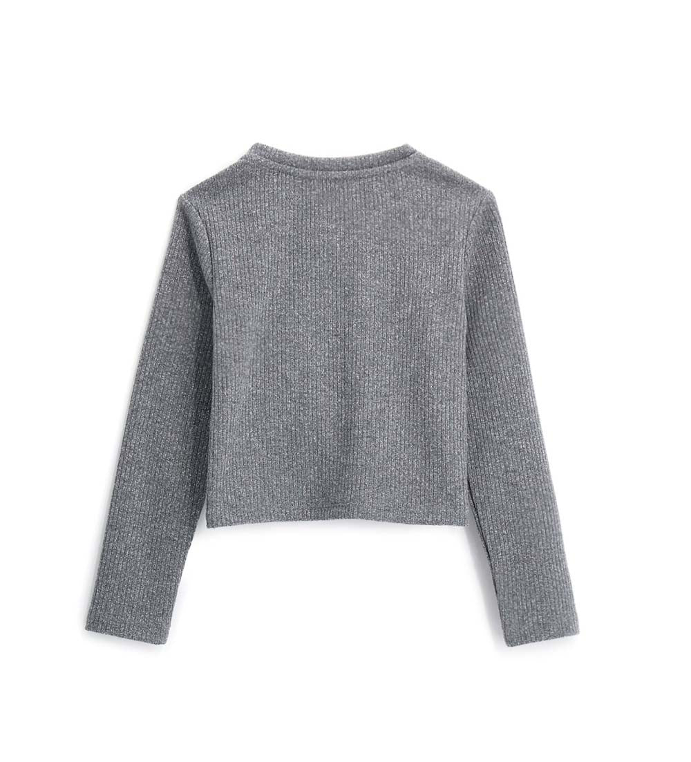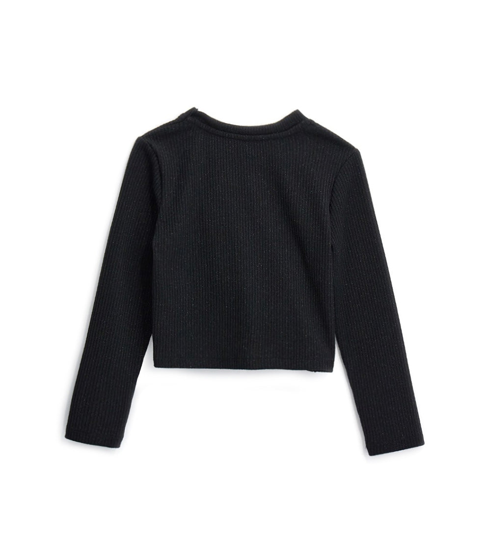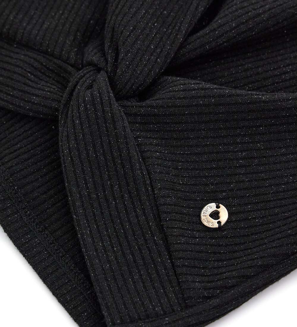 Combinaison camionneur côtelée avec touches de lumière : t-shirt court avec devant croisé et pantalon patte d’éléphant avec taille élastique.