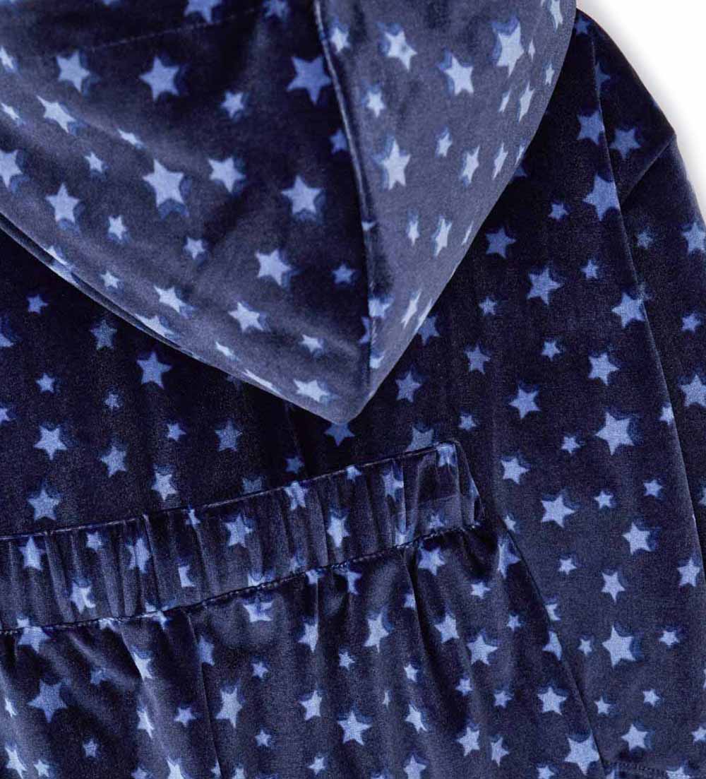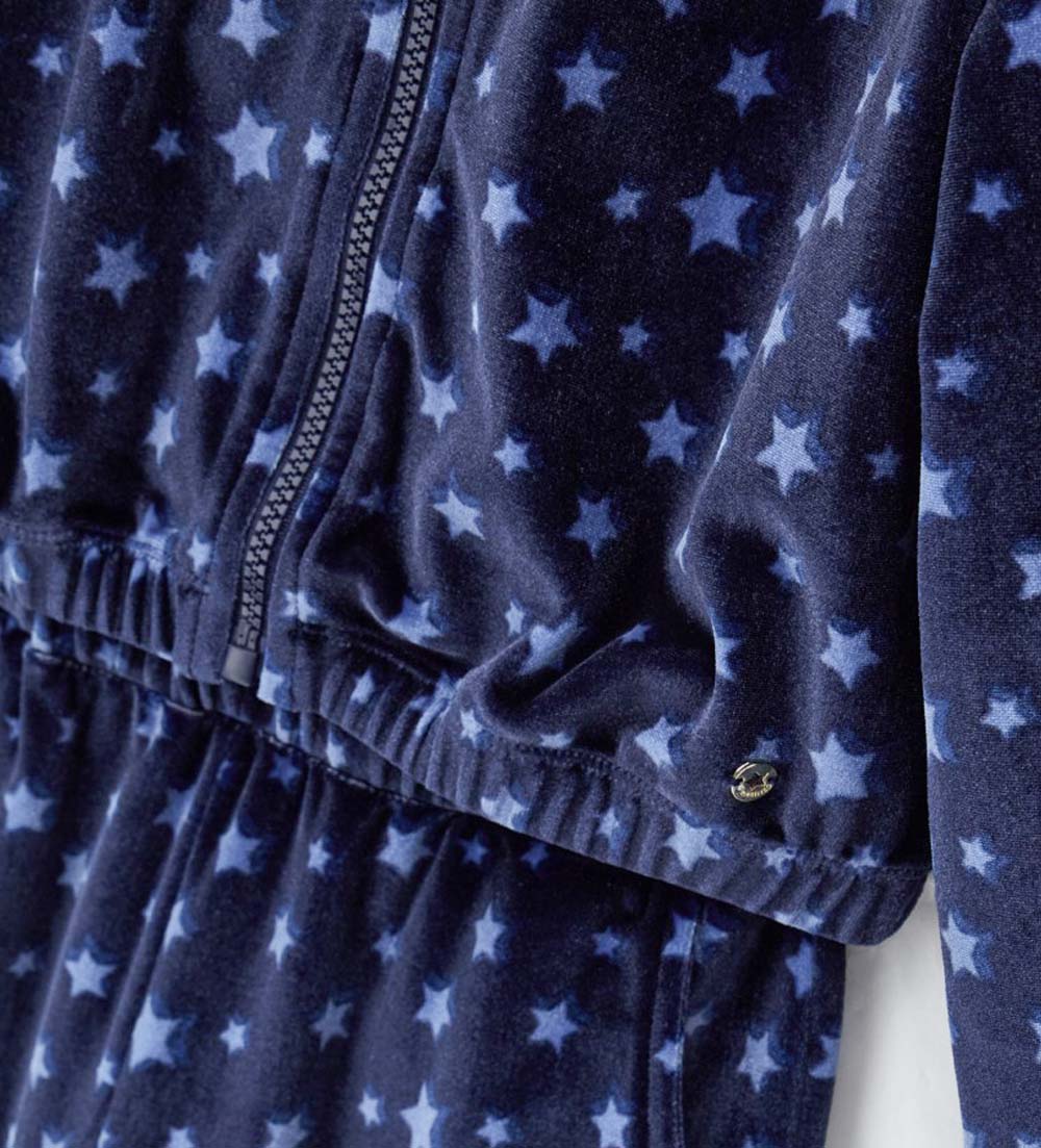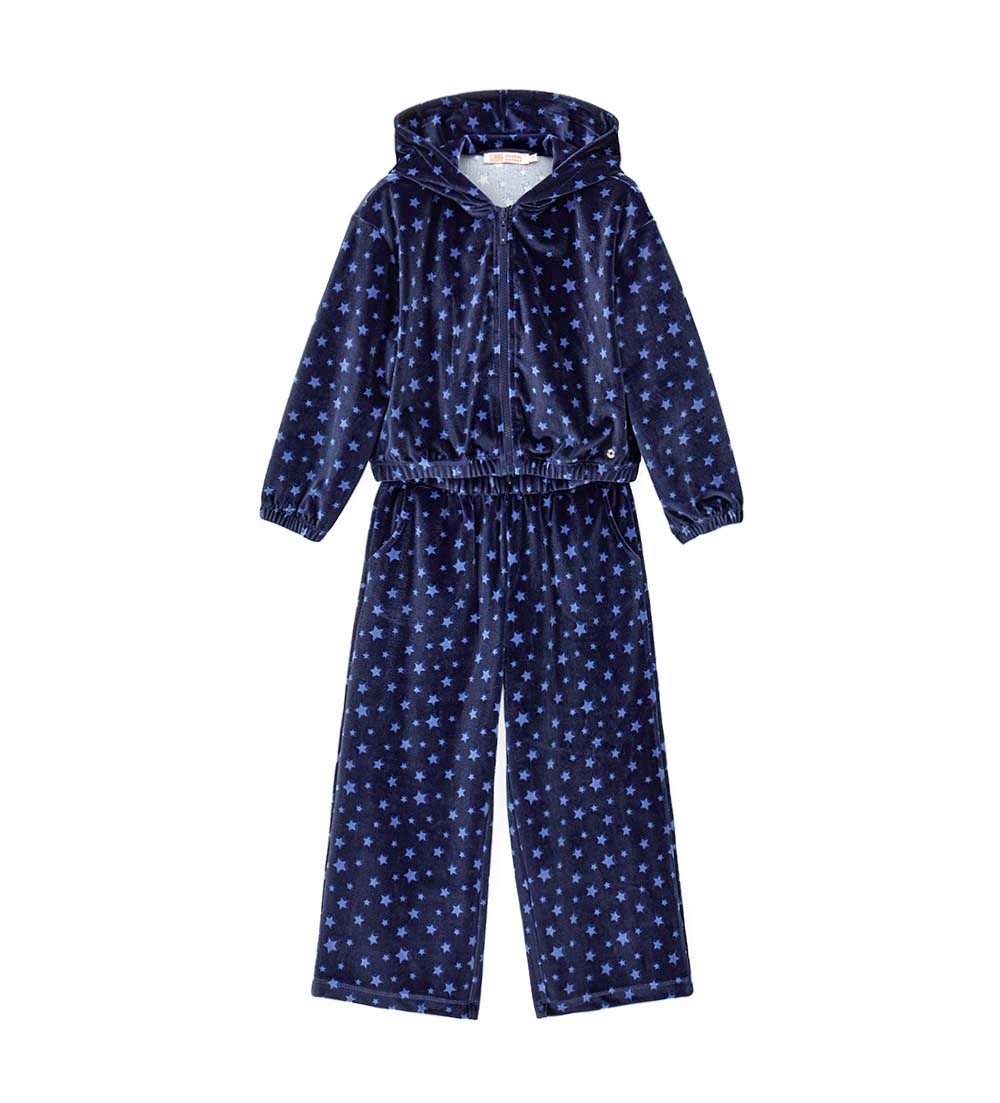 Survêtement en chenille à imprimé étoiles. Sweat à capuche, breloque logo dorée et ouverture sur le devant. Pantalon à taille élastique pour un look pratique et chic.