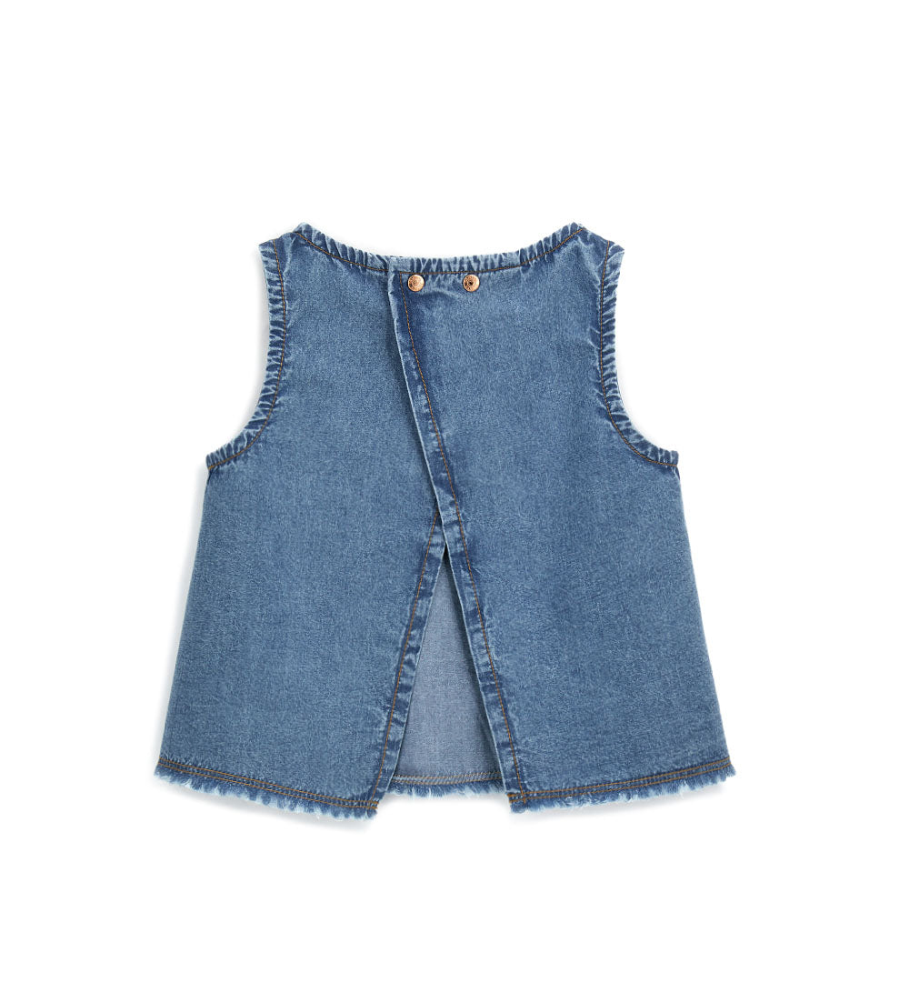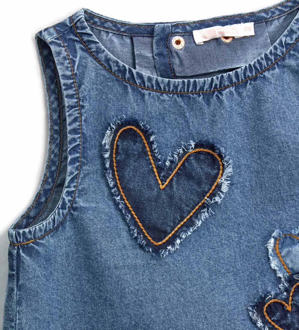 Blouse en chambray sans manches avec ouverture à boutons-pression dans le dos, effilochage dans le bas et cœurs effilochés et appliqués sur le devant.