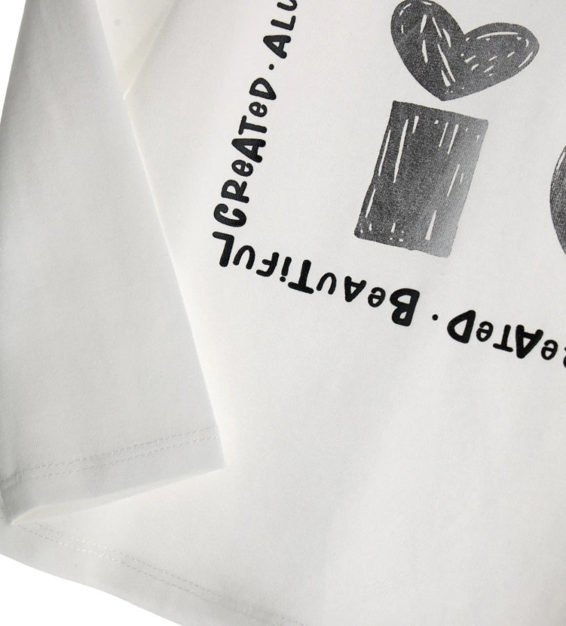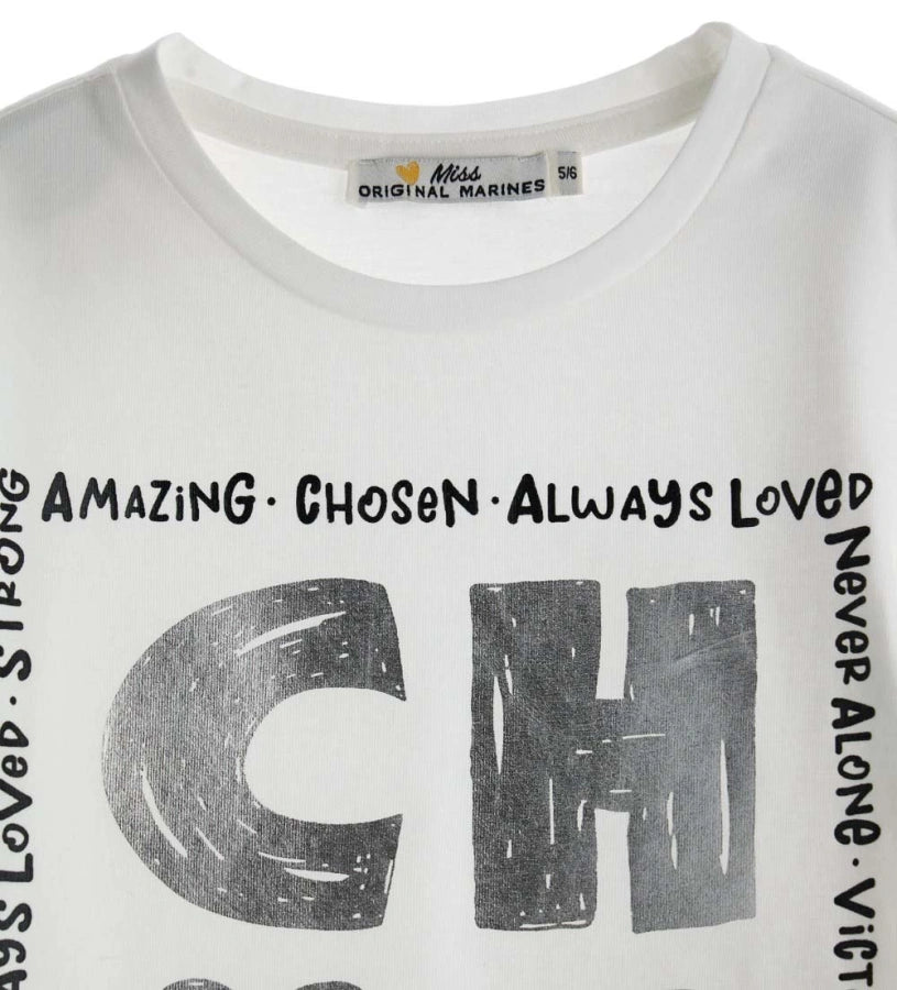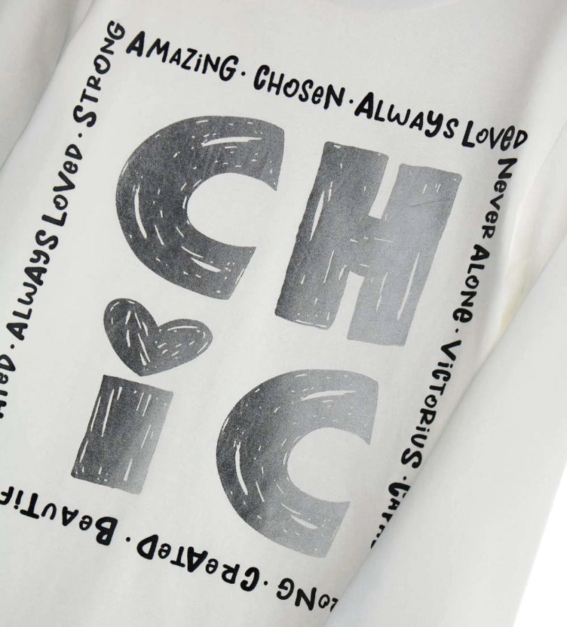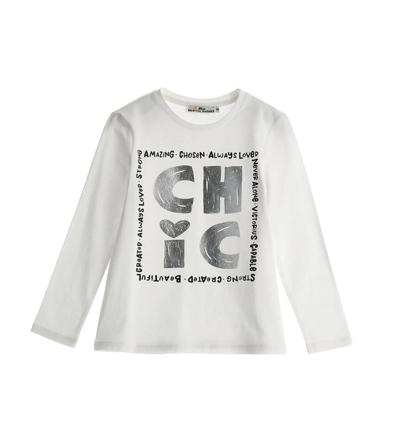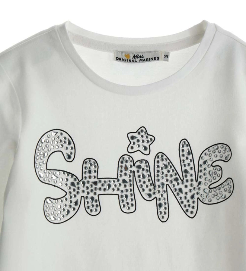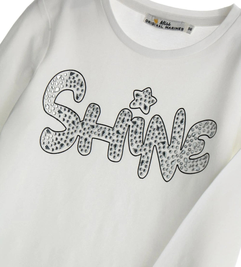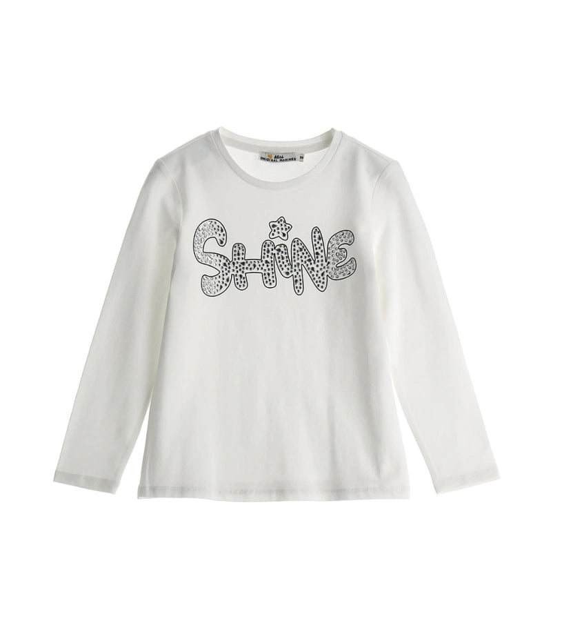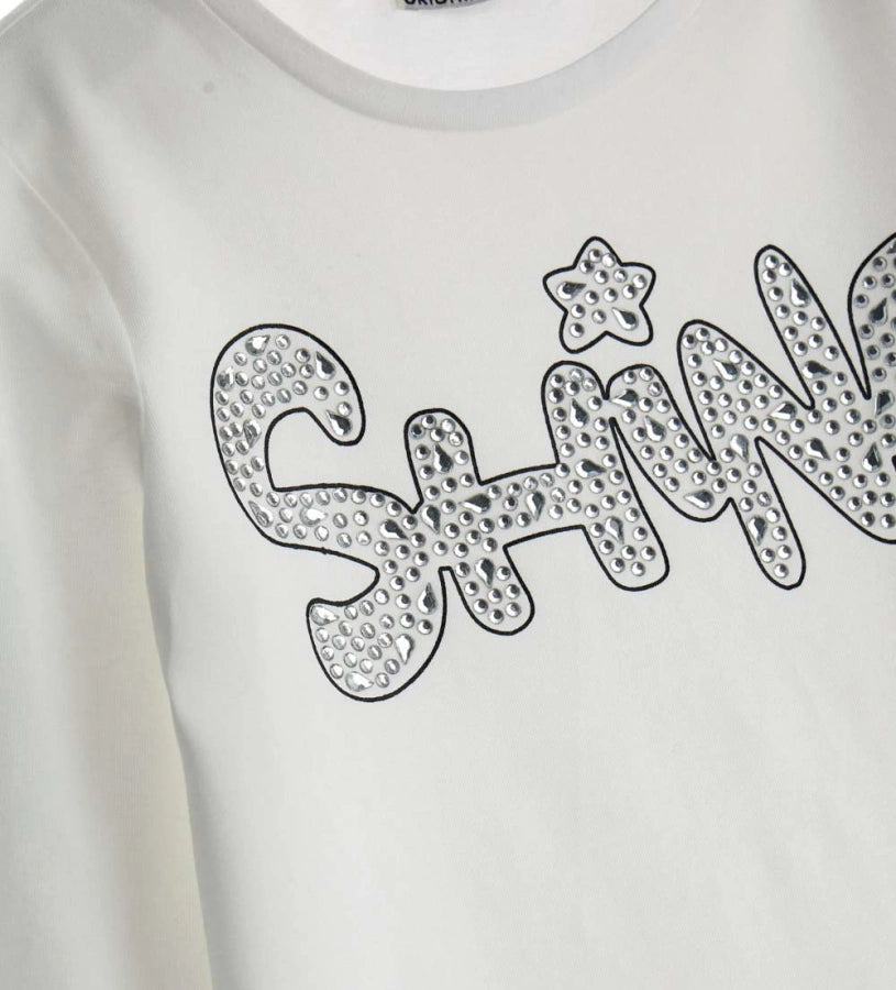 T-shirt ras du cou à manches longues en coton extensible avec imprimé et strass sur le devant.