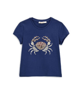 T-shirt à col ras du cou et manches courtes en coton extensible avec imprimé paillettes et broderie sur le devant.