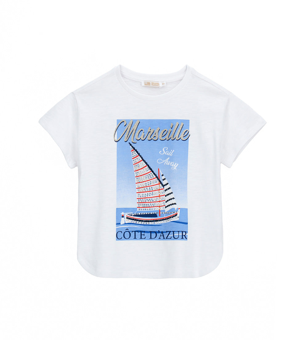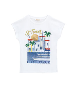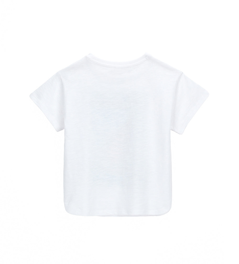 T-shirt à col ras du cou et manches courtes en coton extensible avec détails imprimés en strass sur le devant.
