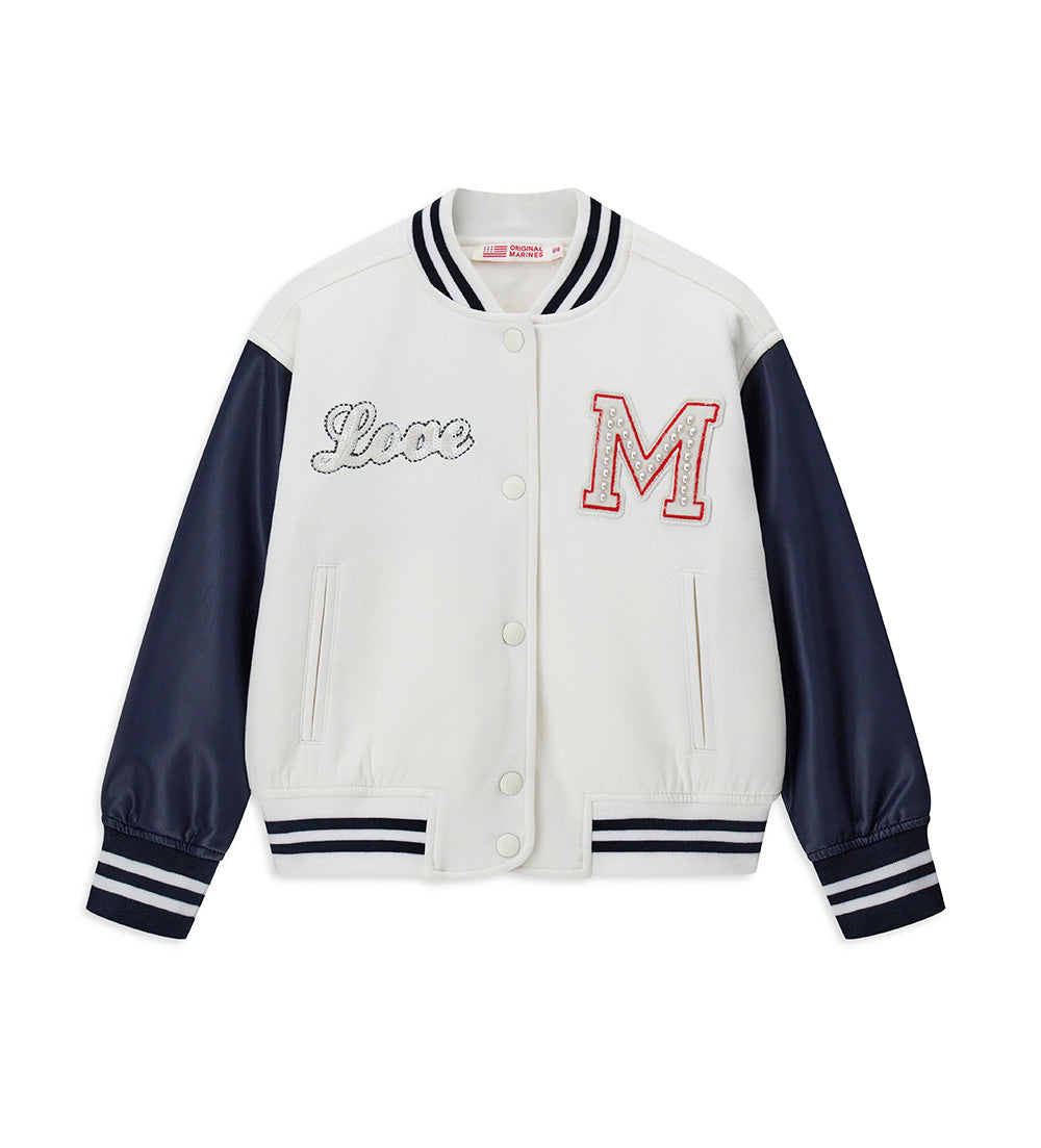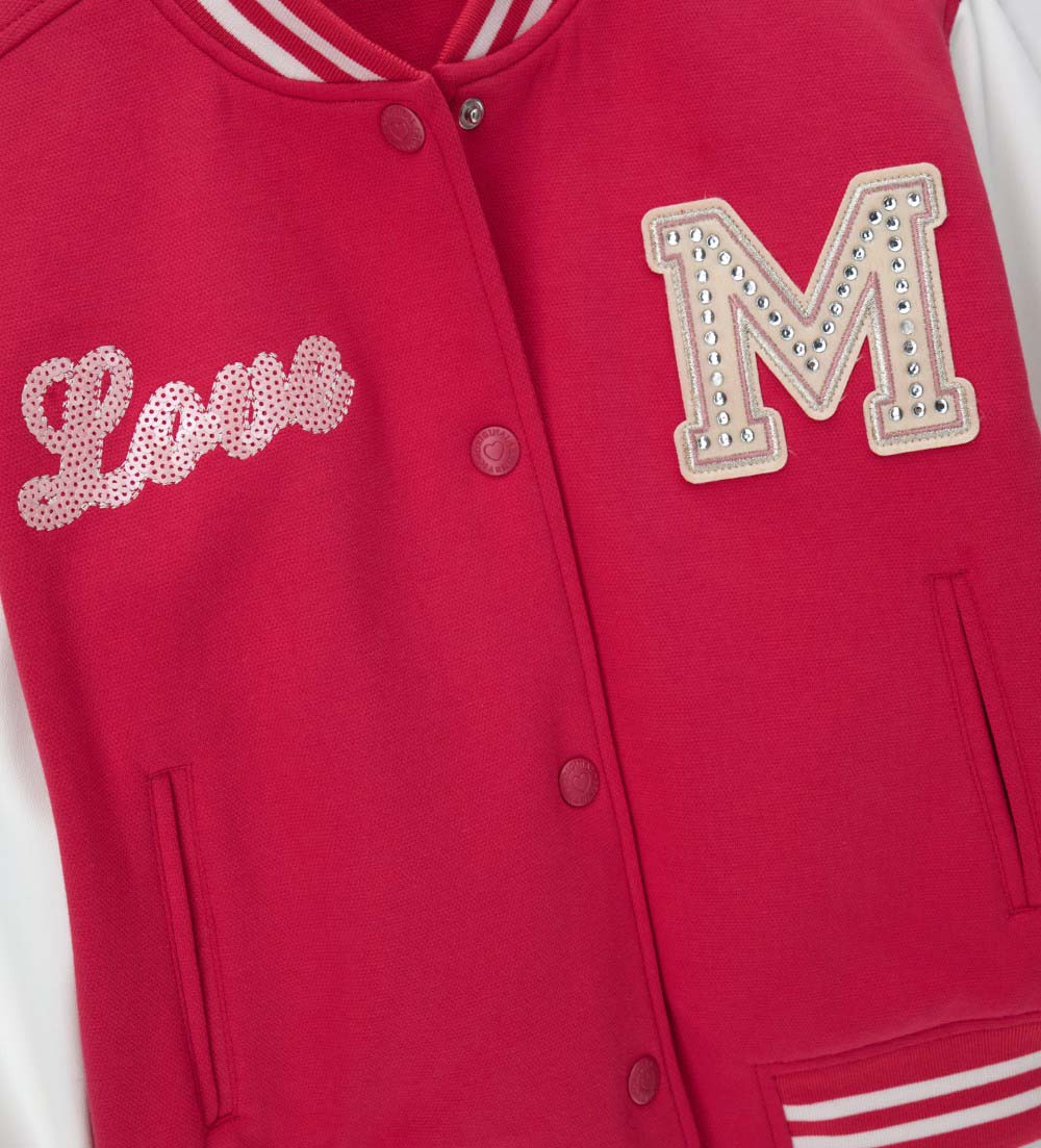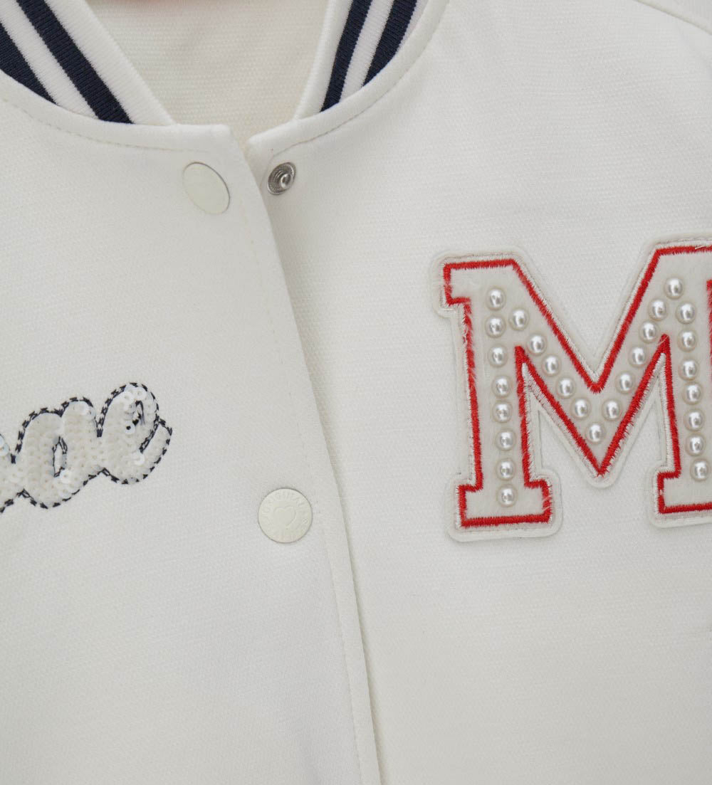 Blouson aviateur en coton extensible avec col rond et manches longues côtelées. Fermeture par boutons-pression, poches avant à bords francs, applications et broderies pour un look dynamique et chic.