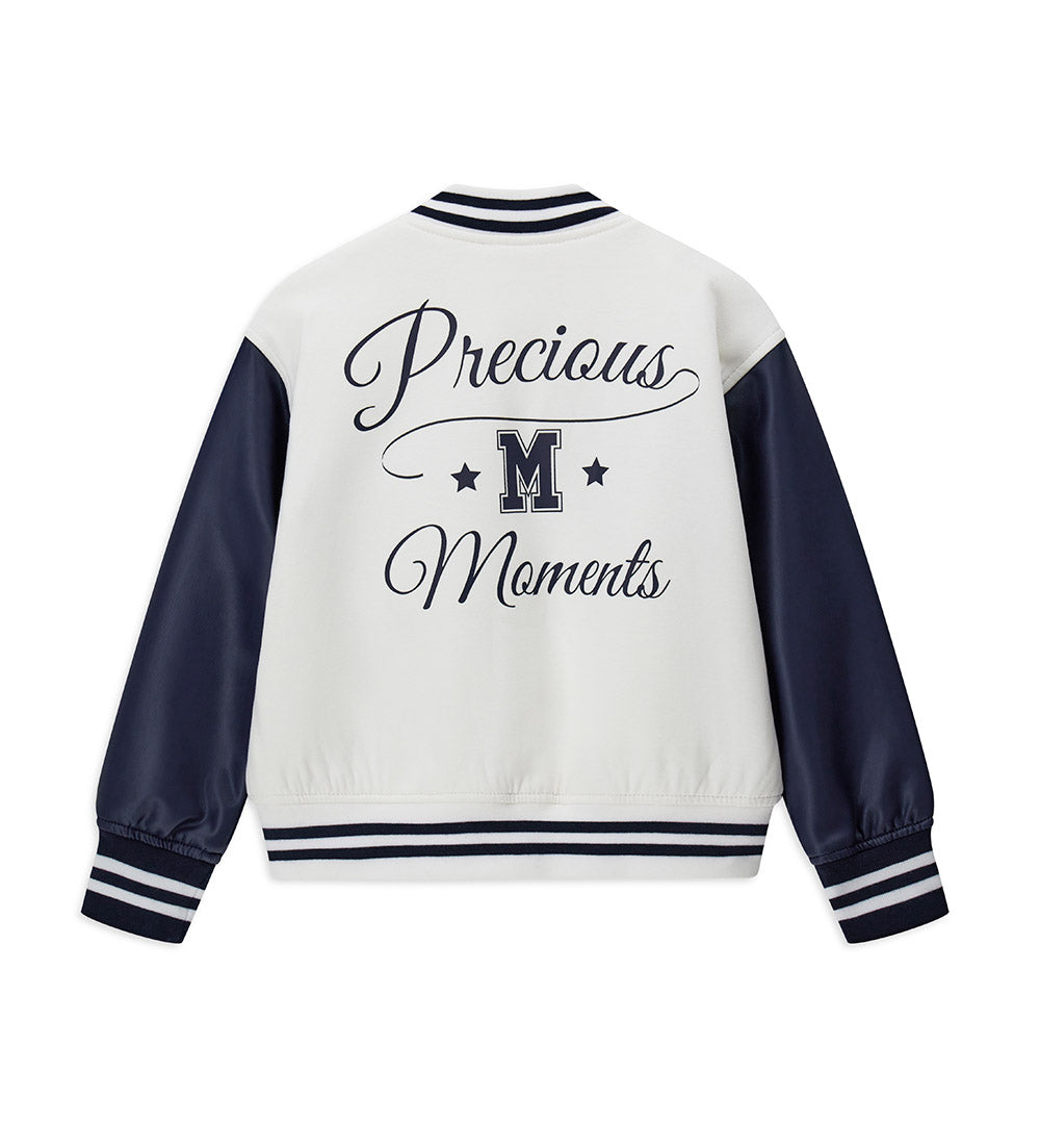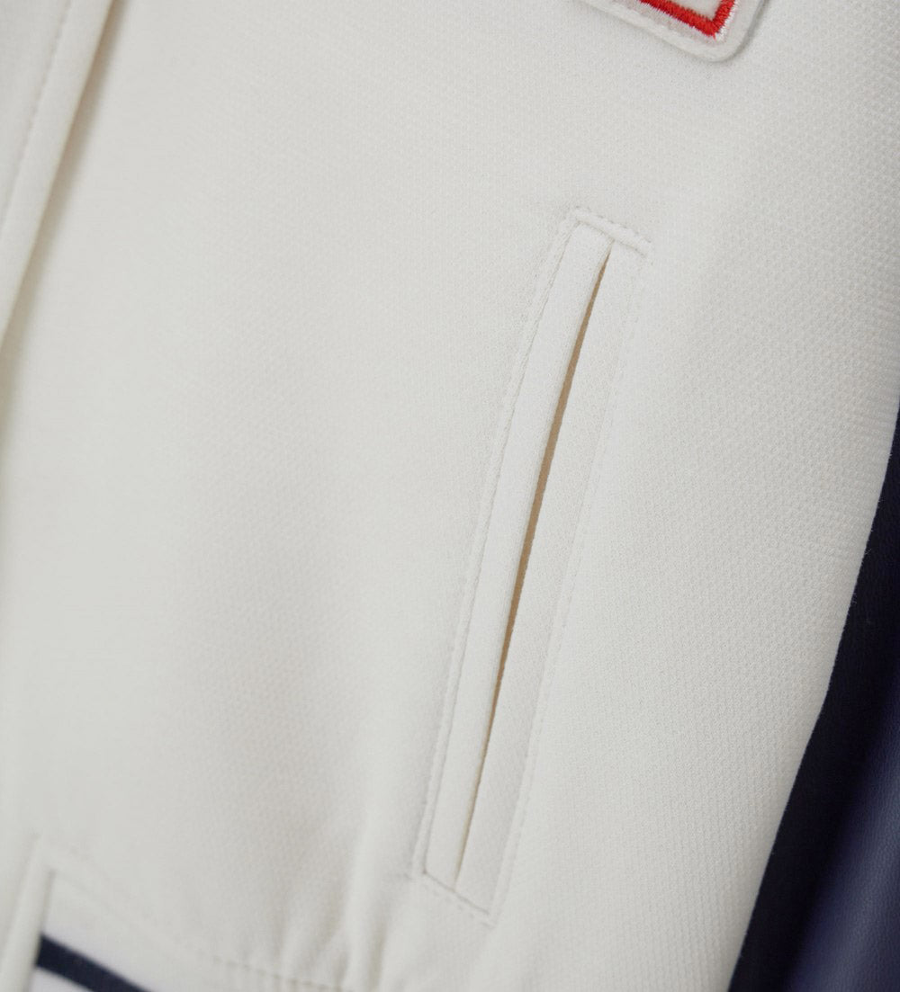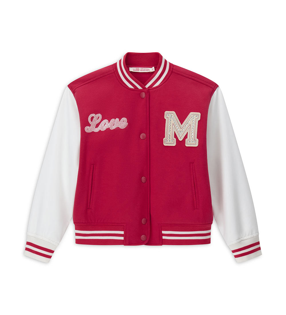 Blouson aviateur en coton extensible avec col rond et manches longues côtelées. Fermeture par boutons-pression, poches avant à bords francs, applications et broderies pour un look dynamique et chic.
