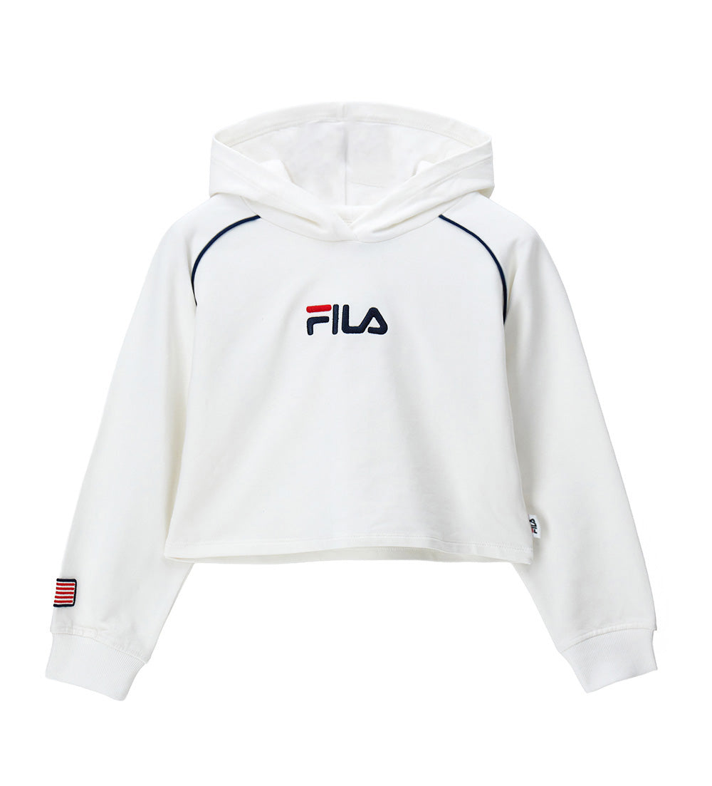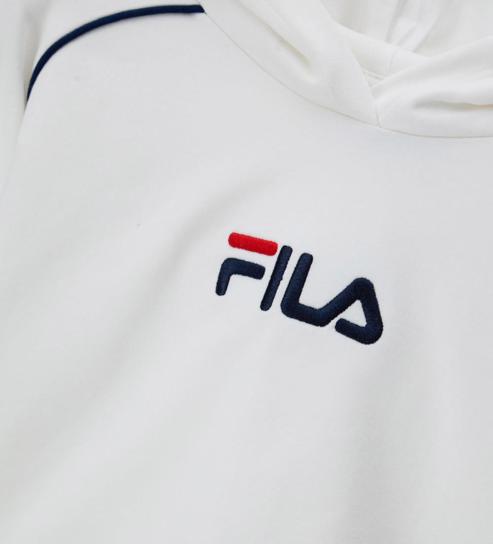 Sweat-shirt Fila en coton extensible avec capuche, logo brodé sur le devant et application sur la manche. Confort et style sportif au quotidien.
