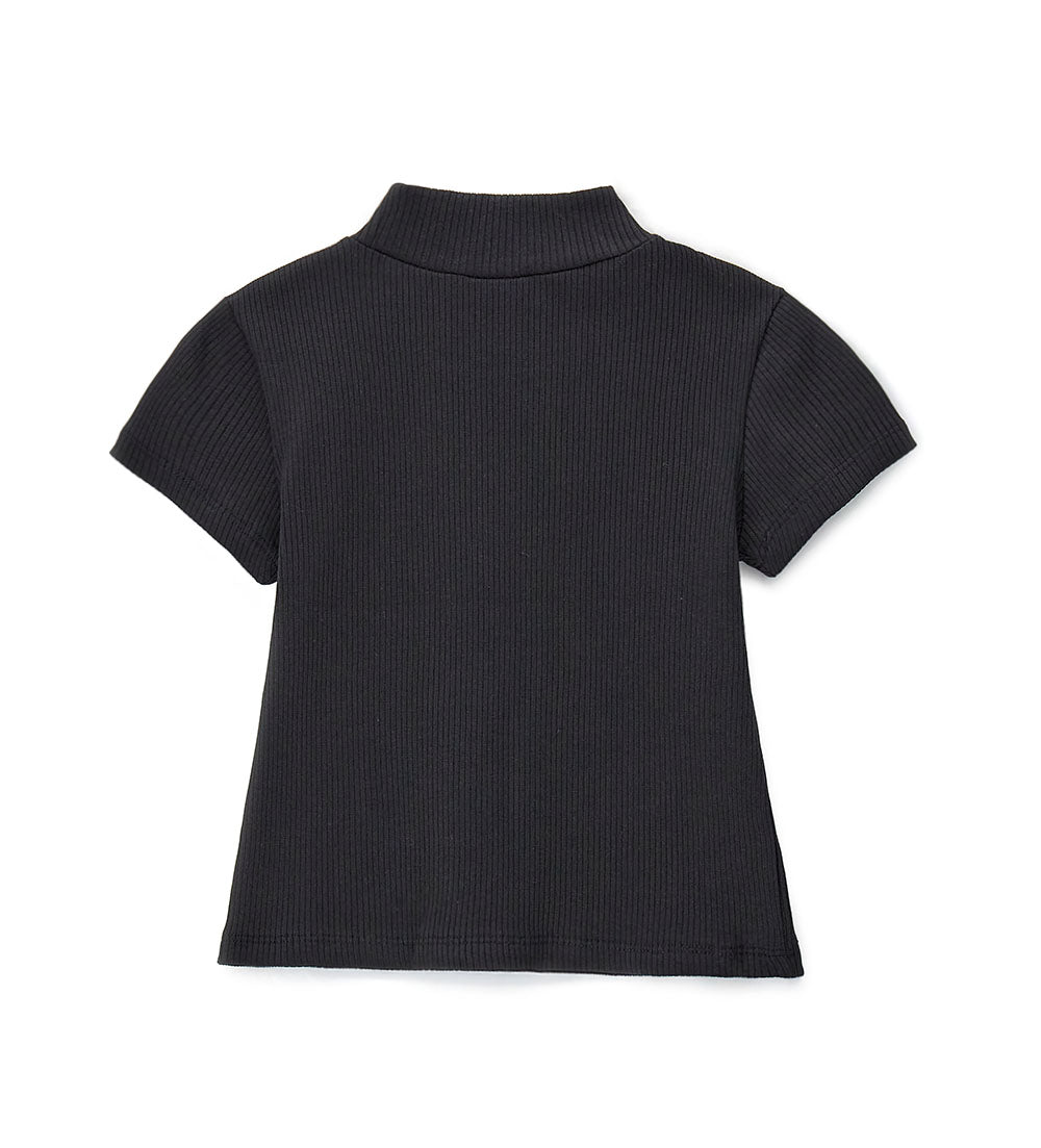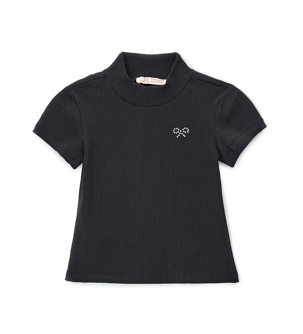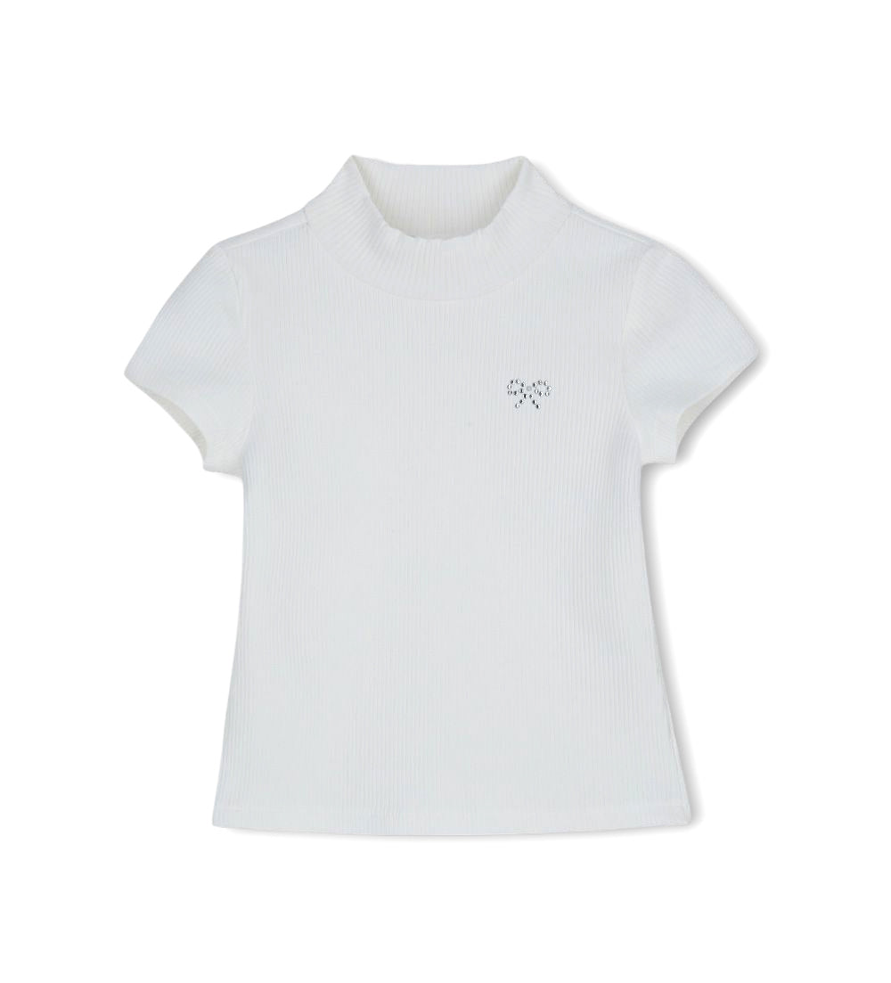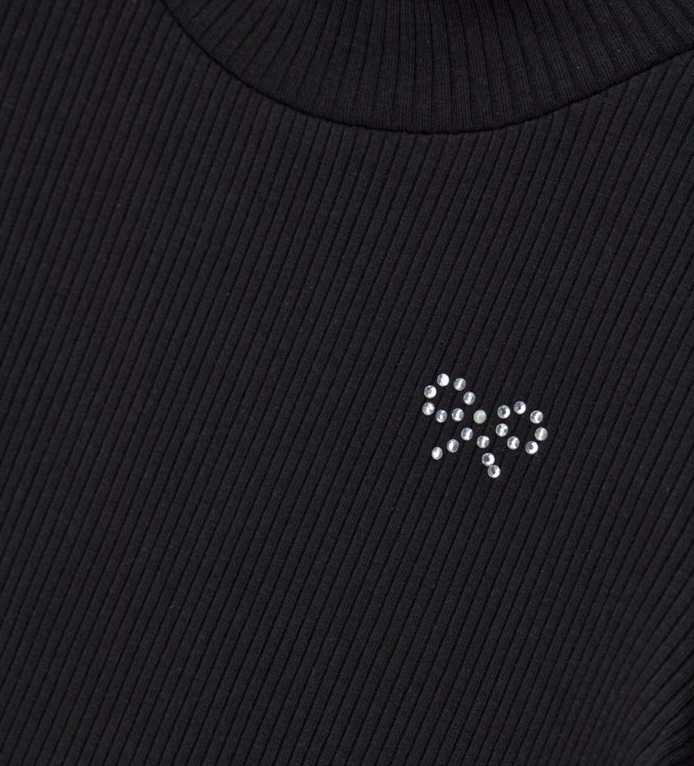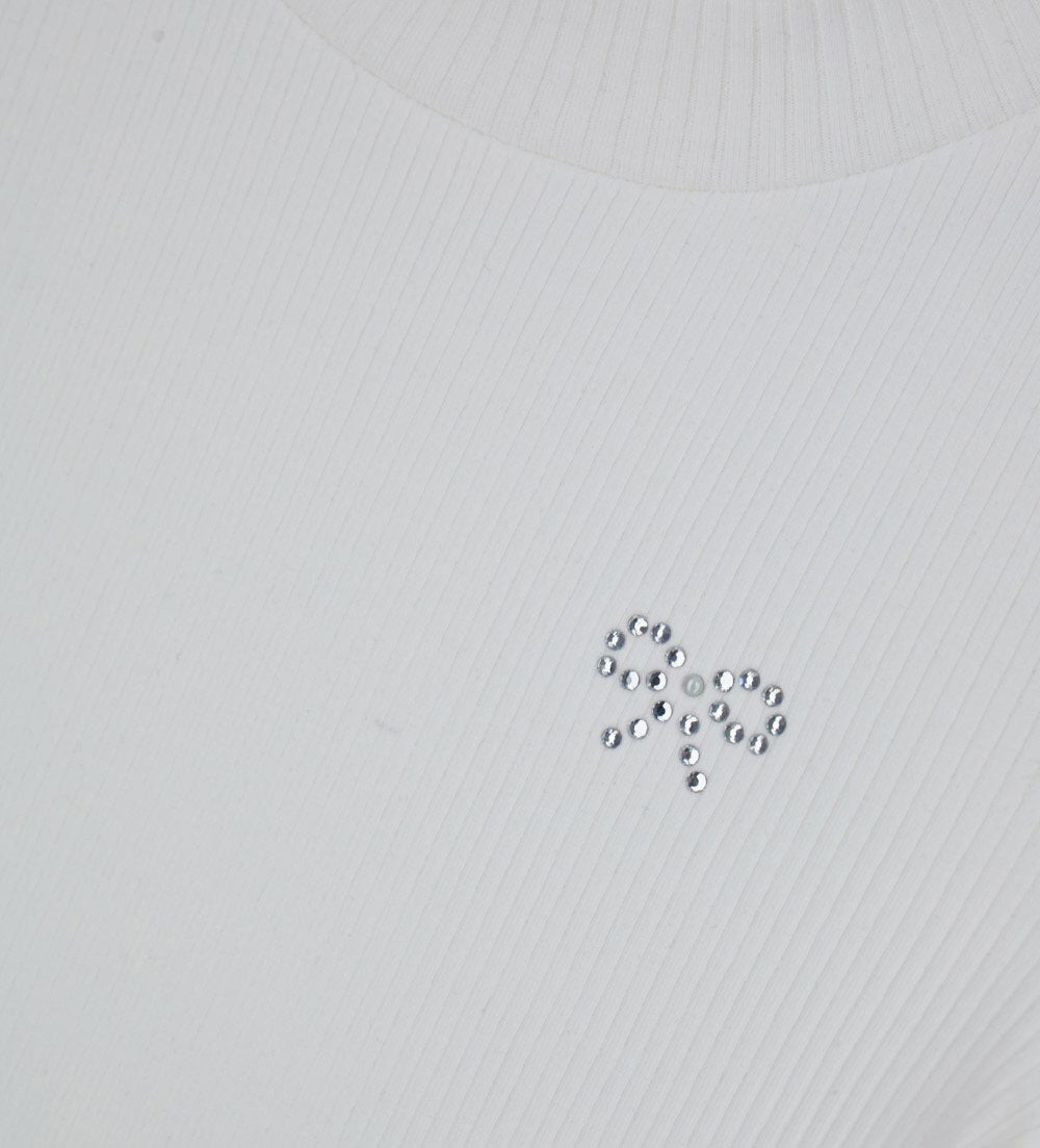 Pull à col roulé en coton côtelé, à manches courtes, orné d’un strass brillant appliqué sur le côté cœur, sur le devant.