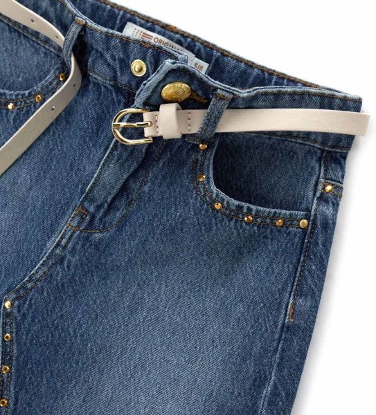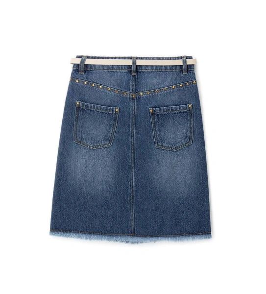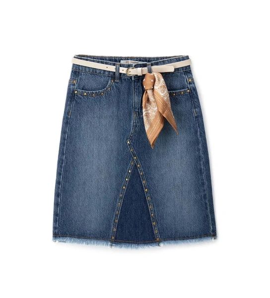 Jupe midi à taille ajustable et boutonnage sur le devant. Poches avant et arrière, clous dorés pour une touche d’élégance, ceinture et foulard amovibles pour un look polyvalent.