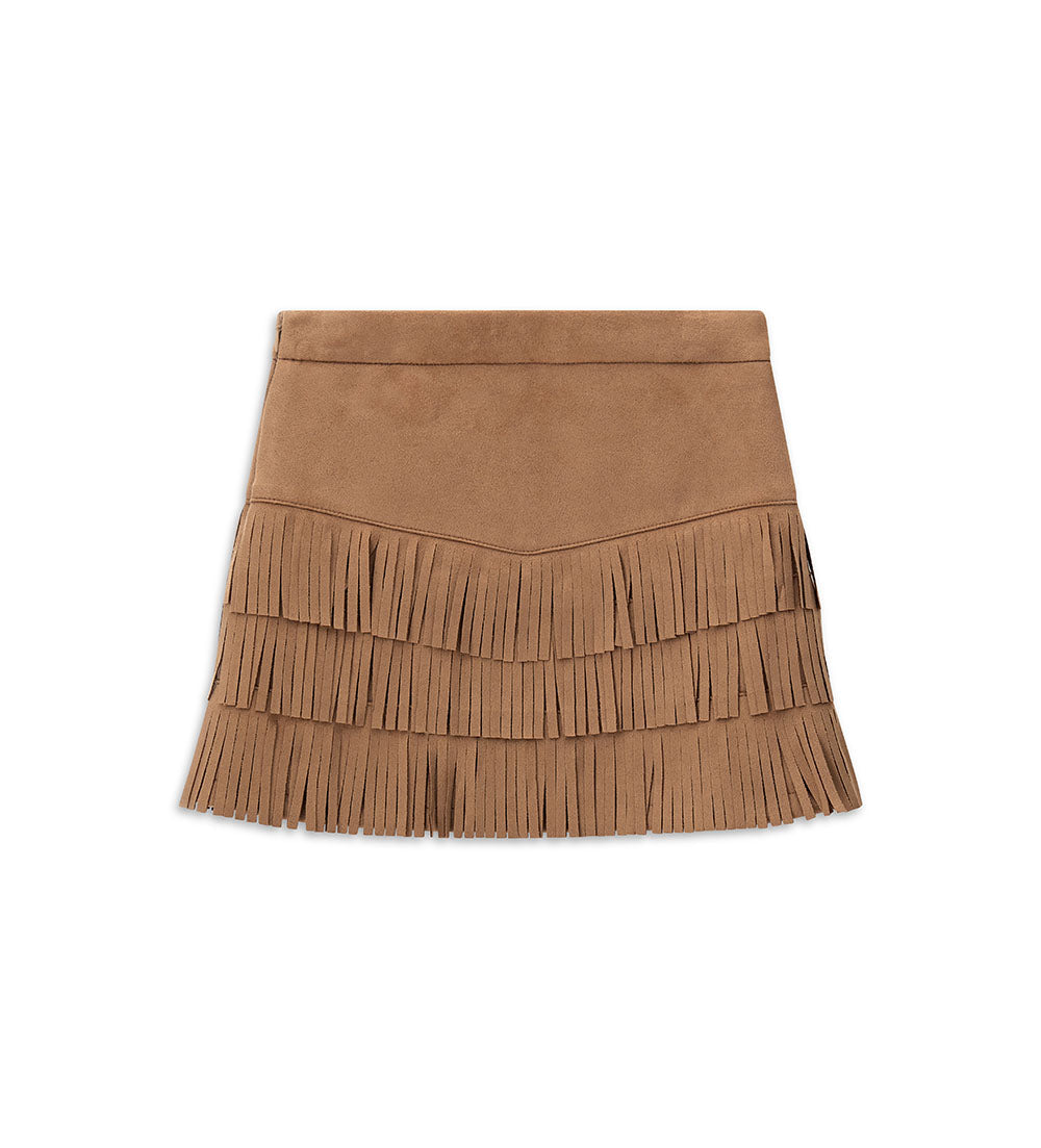 Jupe en daim avec réglage interne et ouverture latérale. Franges et clous pour une touche tendance et dynamique, idéale pour un look élégant et audacieux.