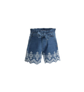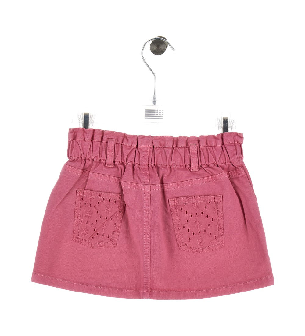 Jupe en coton teint en pièce avec taille élastique, ouverture devant avec boutons pression et zip et poches Sangallo au dos.