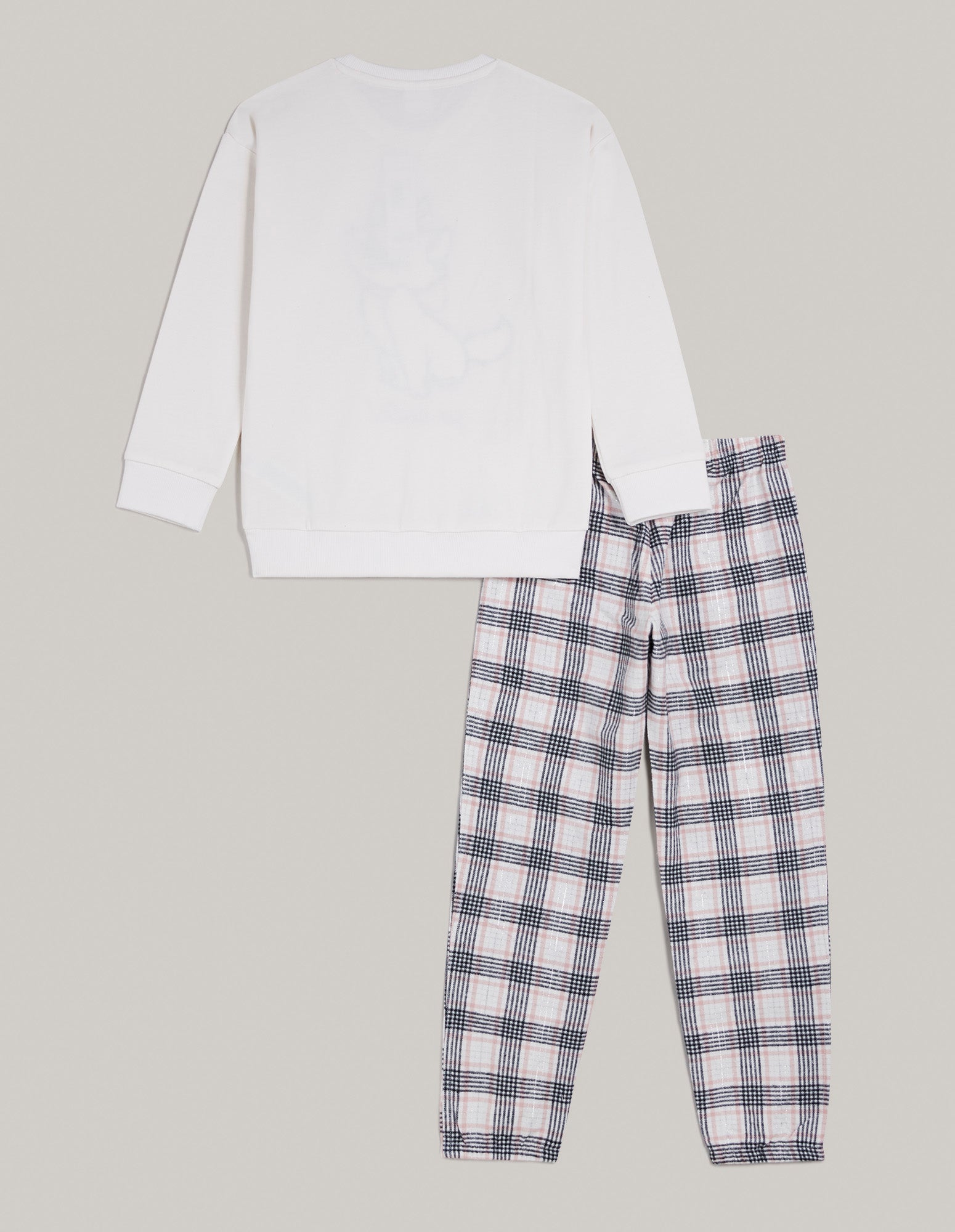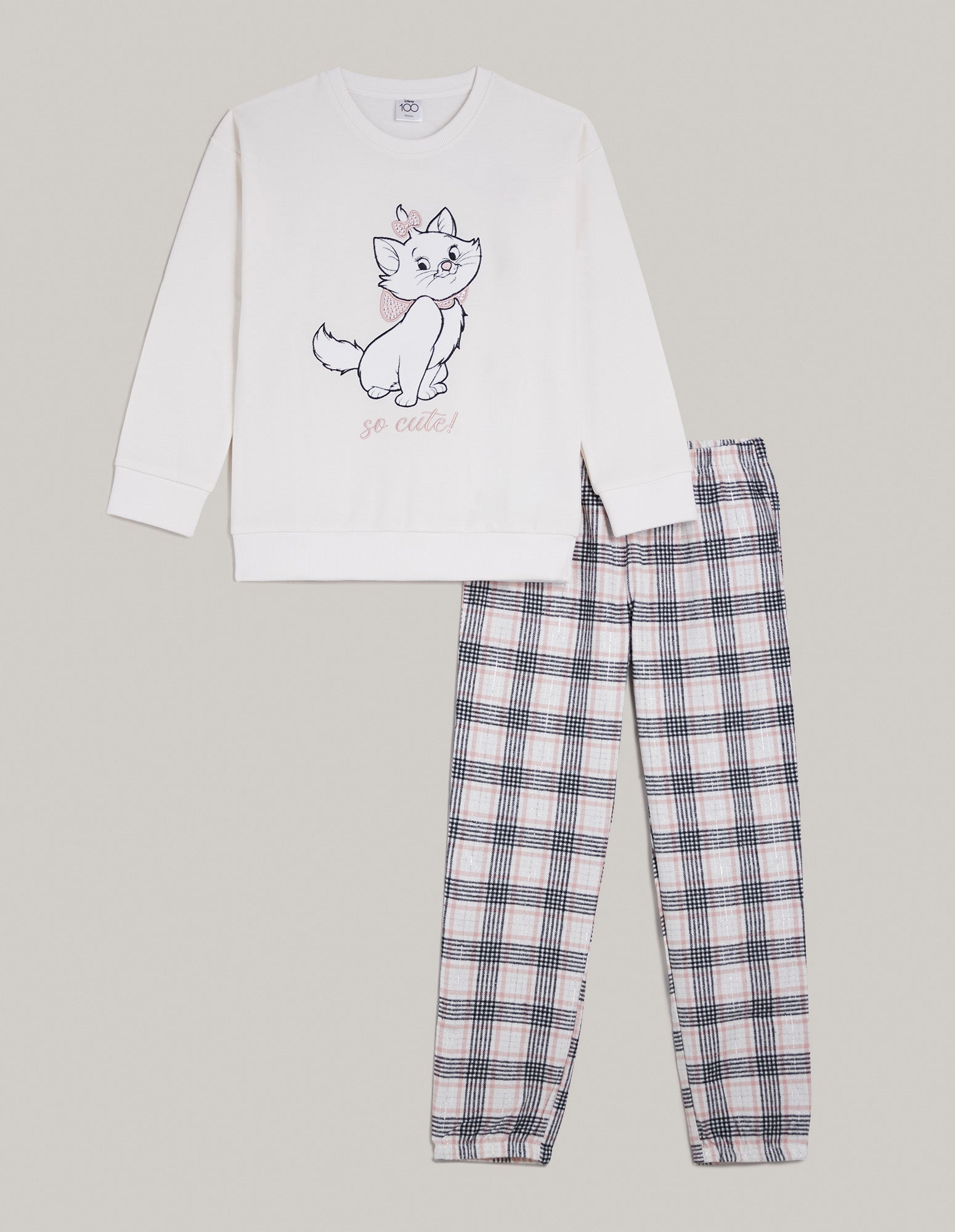 Pyjama long pour fille de la ligne Aristochats© de Yamamay, en collaboration avec Disney©. Inspiré du célèbre film d’animation, ce pyjama ravive la tendresse des petits chats. Le jersey de coton est blanc uni et présente un imprimé central représentant le chaton Minou des Aristochats. Le pantalon en flanelle présente un motif à carreaux écossais et un cordon de serrage à la taille pour un confort optimal. Il peut être combiné avec les pyjamas femme de la même ligne.