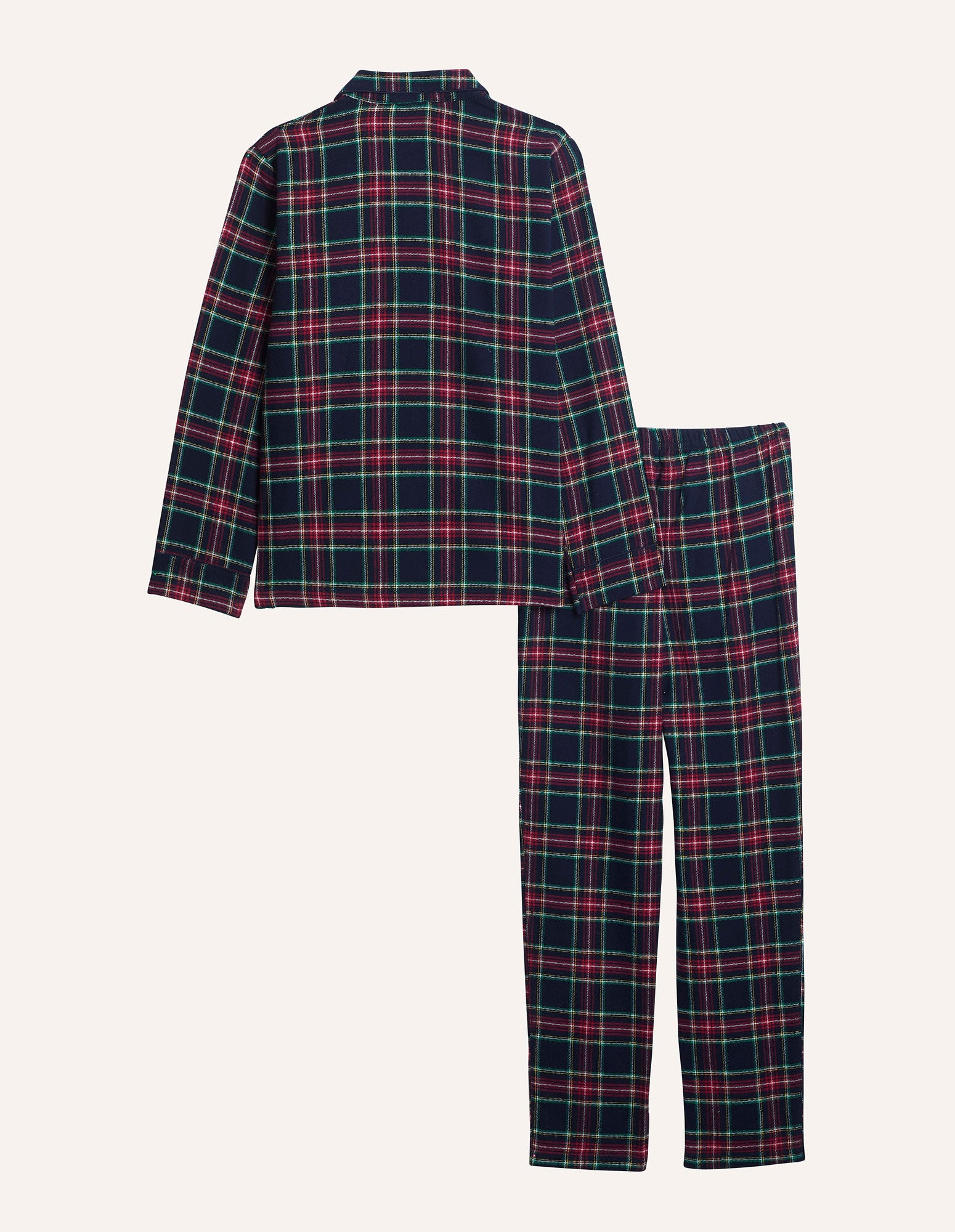 Pyjama long ouvert en 100 % coton délicat. Imprimé tartan classique dans des tons bleus et rouges. Chemise à manches longues avec fermeture boutonnée et poche avant. Pantalon à taille élastique pratique. Coupe confortable et douce. Idéal pour recréer des tenues assorties avec toute la famille.
