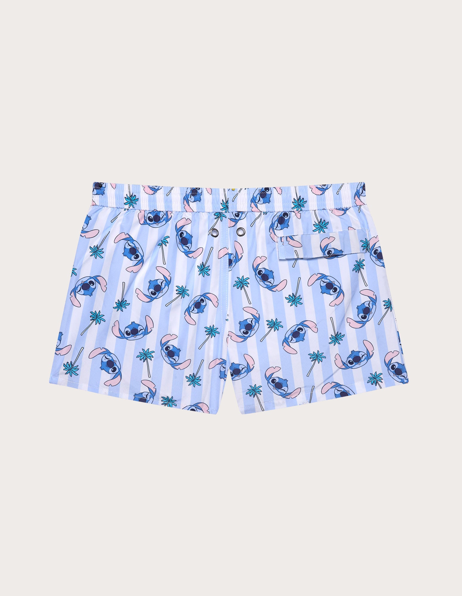 Le boxer de bain rayé Stitch pour garçon est confectionné dans un tissu léger à séchage rapide. Il arbore un imprimé intégral de Stitch dans différentes poses sur des rayures verticales bleues et roses, avec des détails palmiers. La taille élastique avec cordon de serrage intérieur assure un maintien parfait, et la poche arrière est pratique.