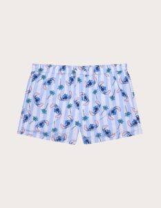 Le boxer de bain bleu Stitch pour garçon est confectionné en tissu à séchage rapide et arbore un imprimé cartographique illustré avec des éléments marins et hawaïens, ainsi qu’un motif surfeur Stitch sur la jambe. La taille élastiquée et le cordon de serrage réglable offrent confort et maintien. Une poche plaquée est également présente à l’arrière.