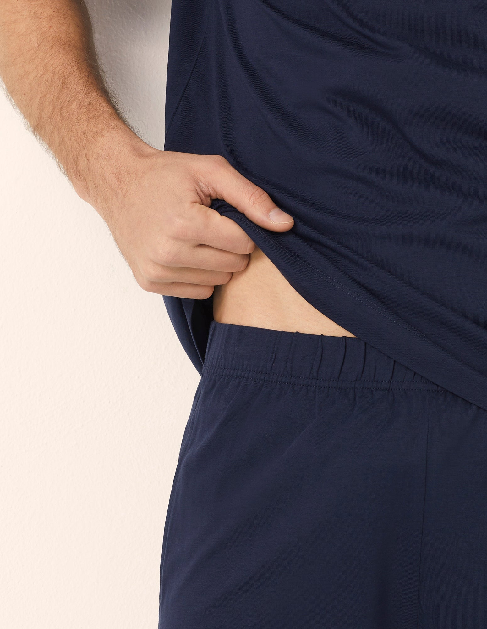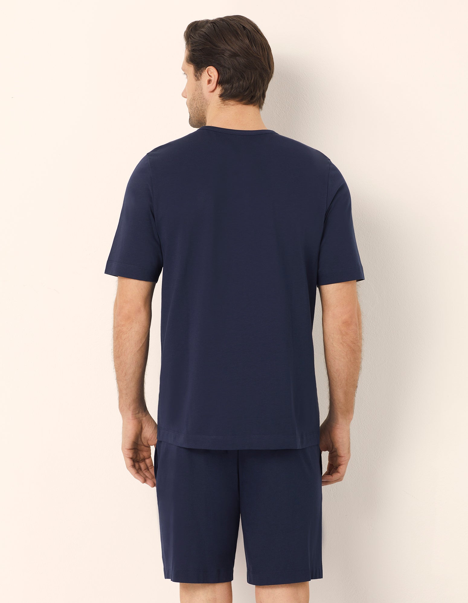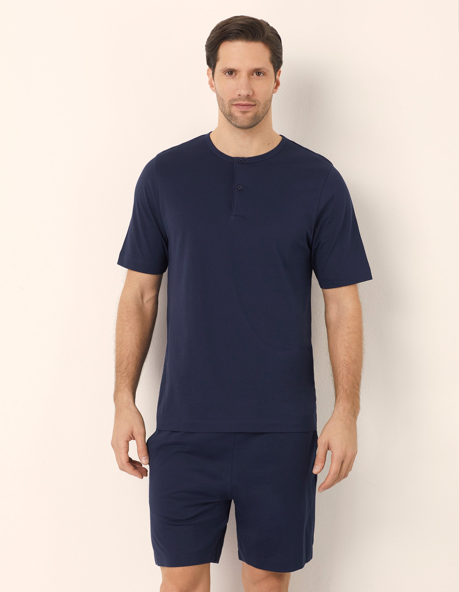 Pyjama court homme en coton bleu foncé. T-shirt à manches courtes et col rond boutonné. Short uni avec poches et taille élastique.
