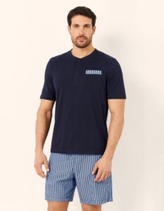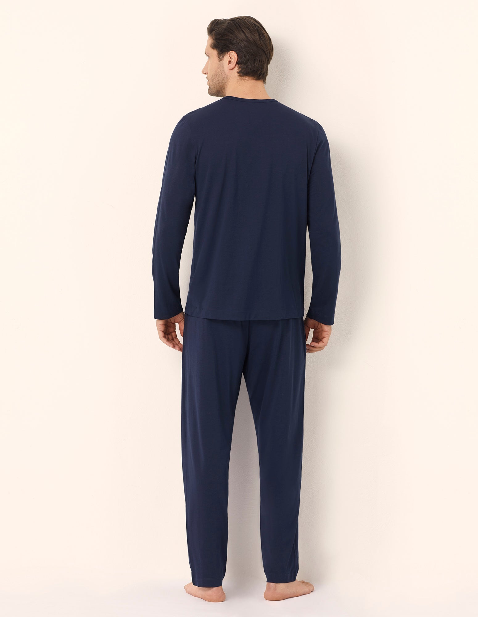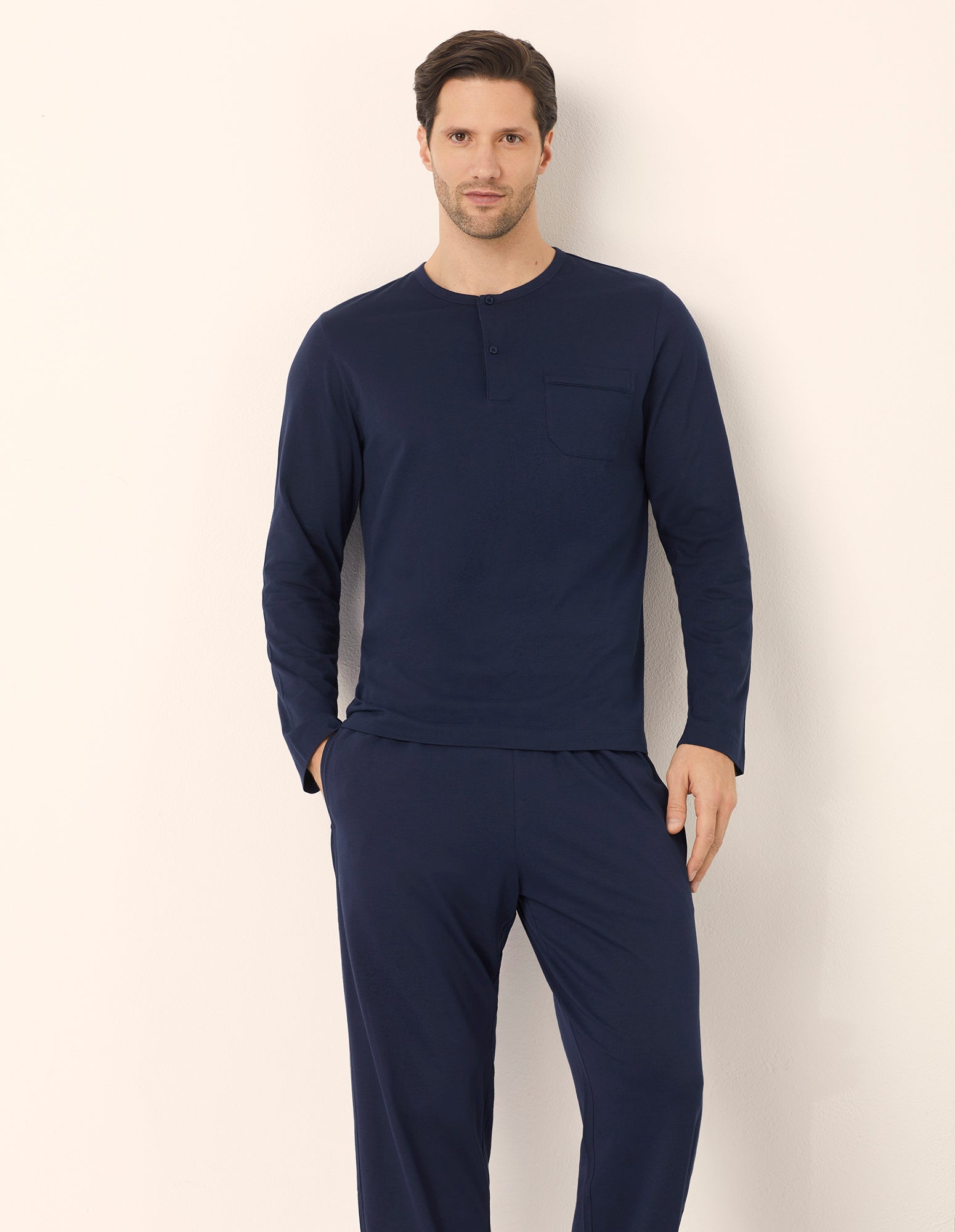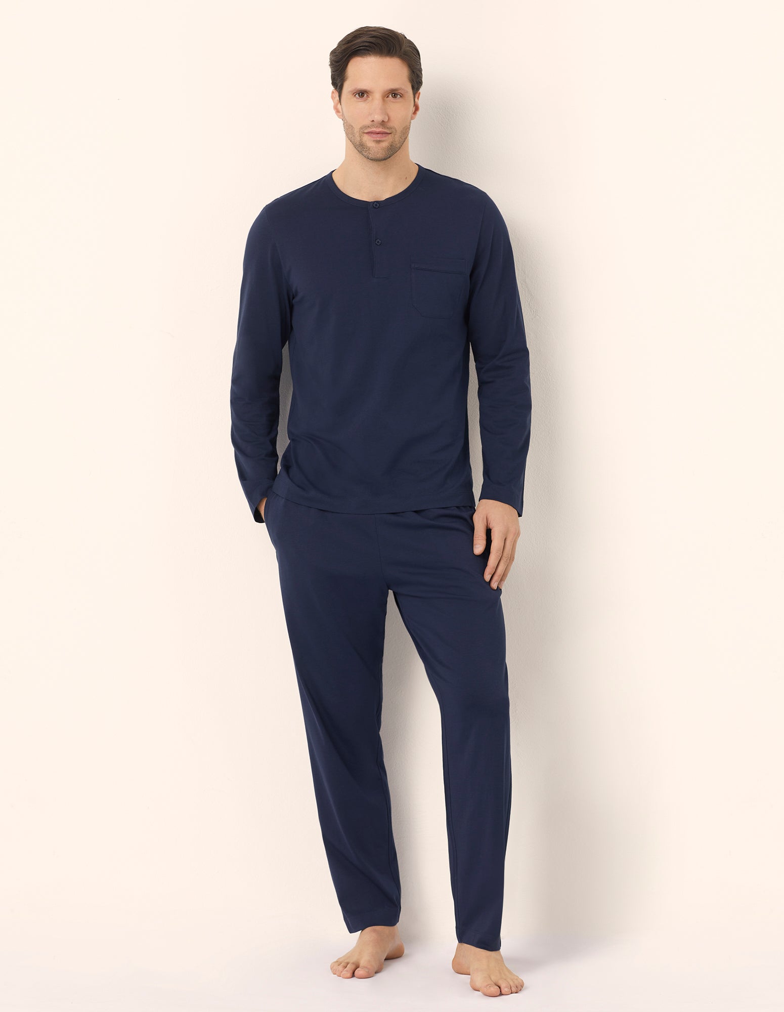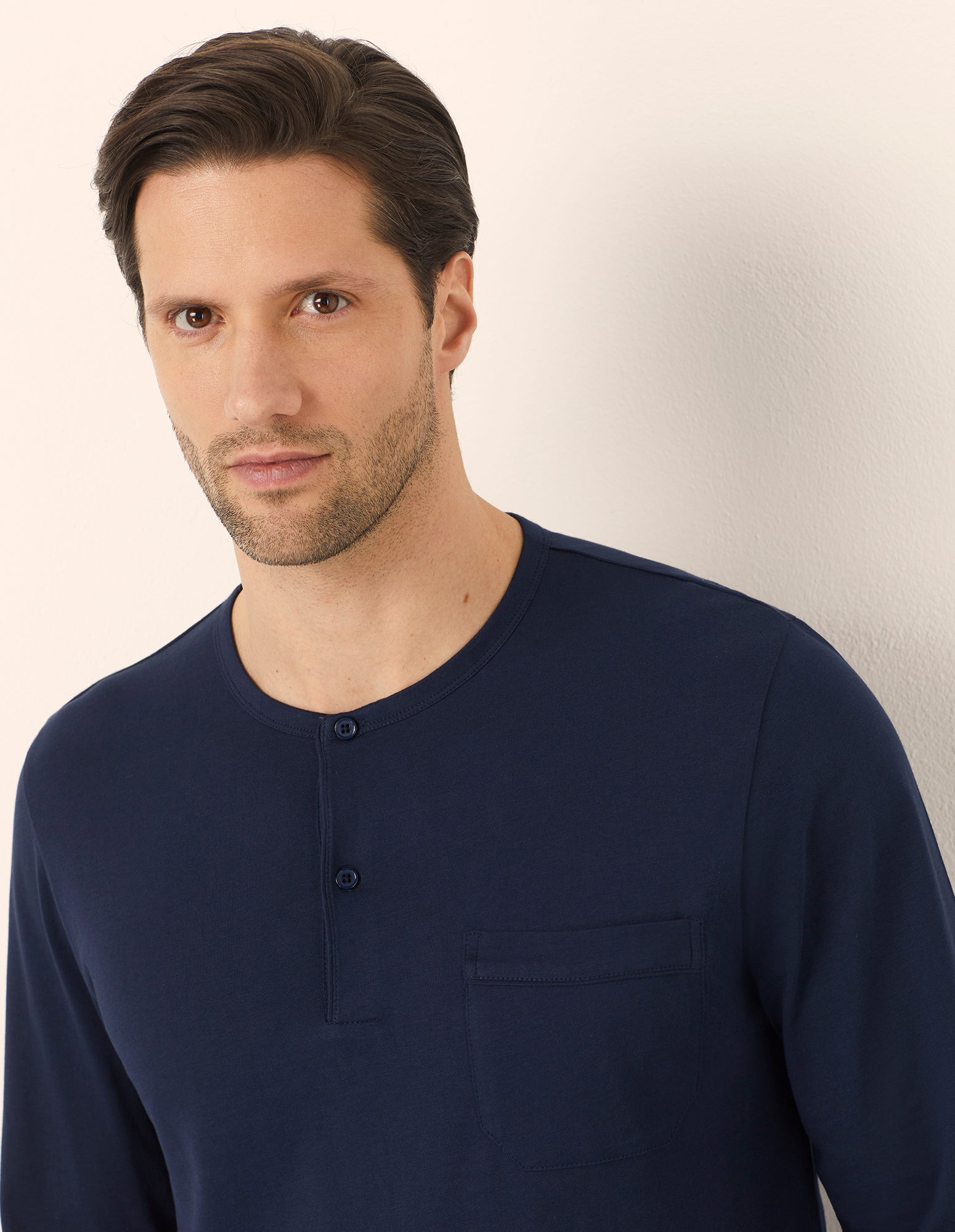 Pyjama long bleu foncé pour homme en jersey 100 % coton, composé d’un haut et d’un pantalon style Henley avec poches et ceinture élastique souple et recouverte. Avec la vente de ce vêtement, Yamamay soutient la mission Better Cotton.