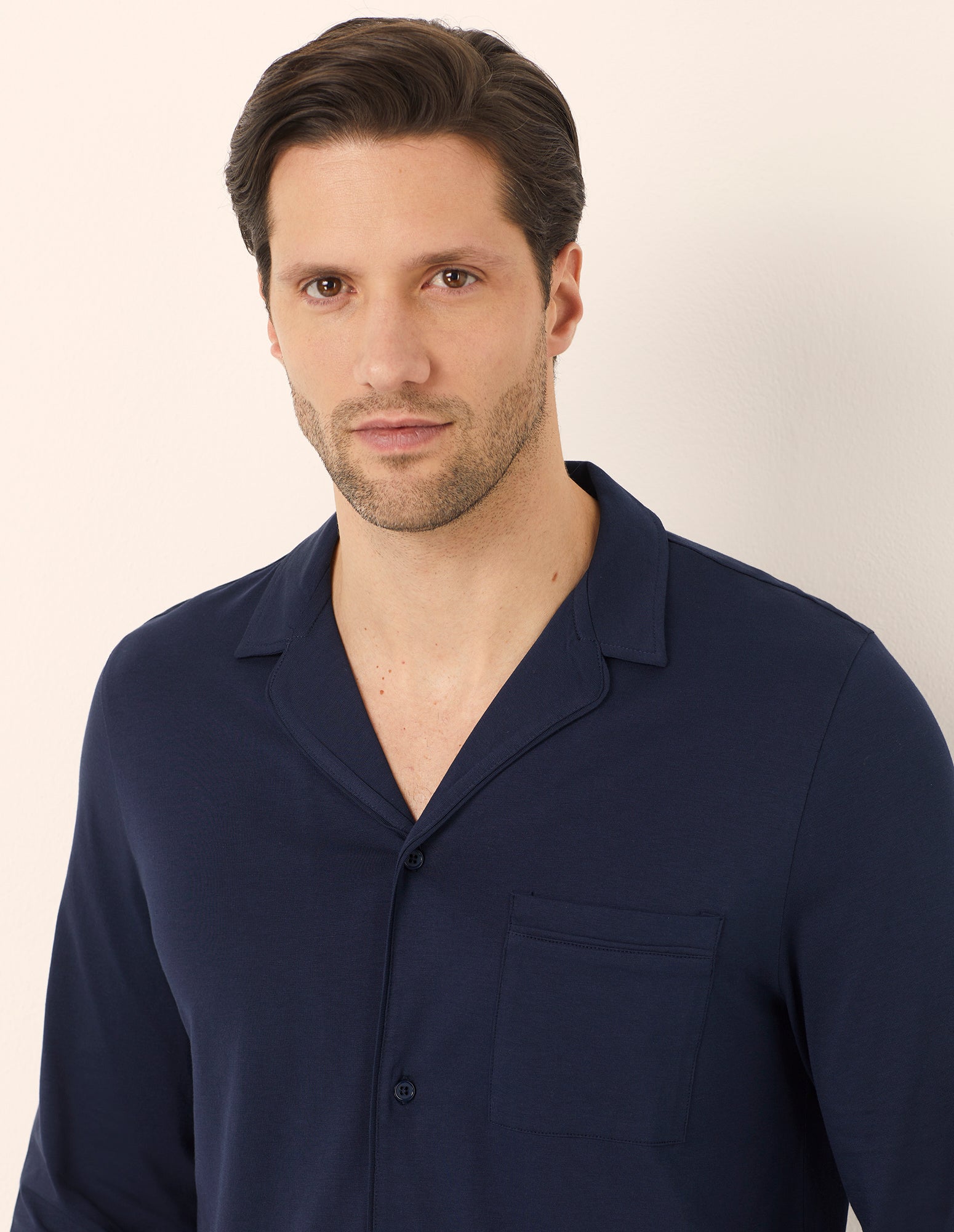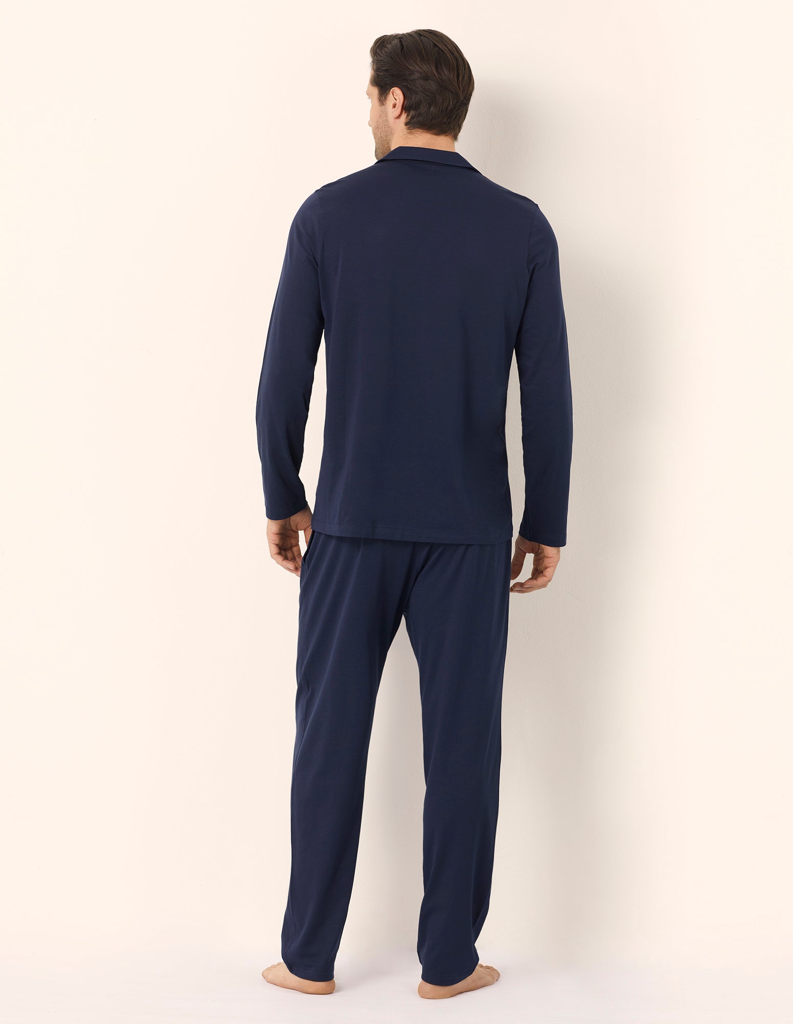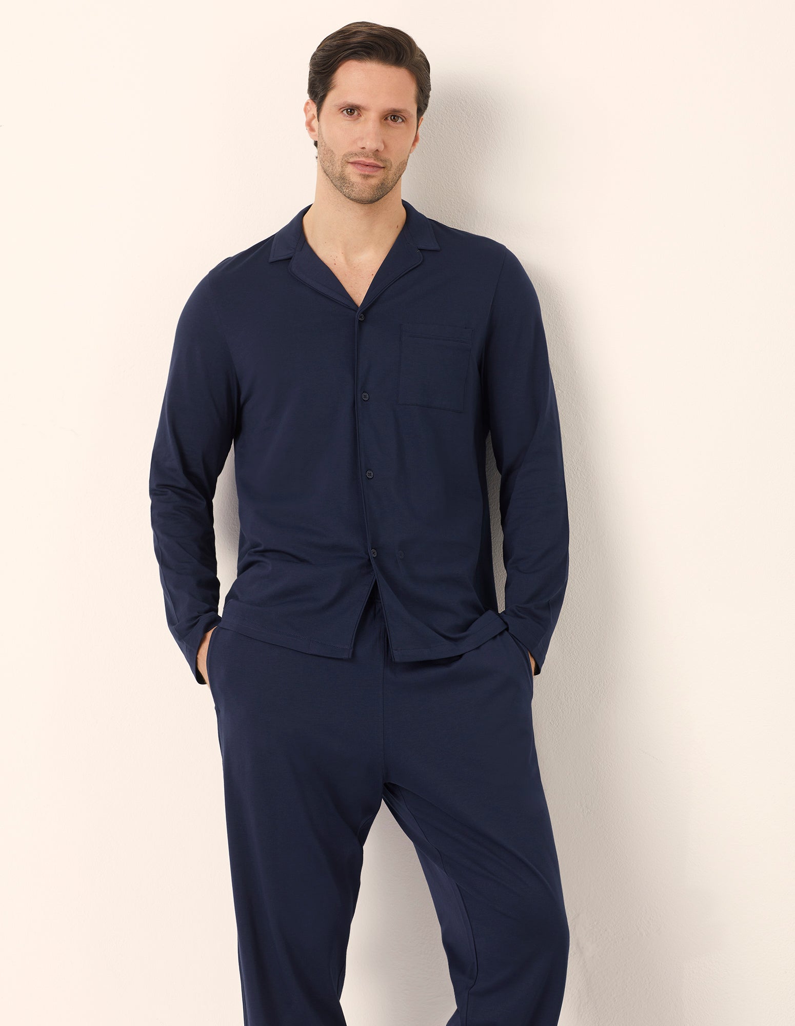 Pyjama long pour homme en jersey de coton bleu foncé. Haut à manches longues, coupe chemise boutonnée, col et poche poitrine. Pantalon long avec ceinture élastique recouverte et poches. Avec la vente de ce vêtement, Yamamay contribue à la mission Better Cotton.