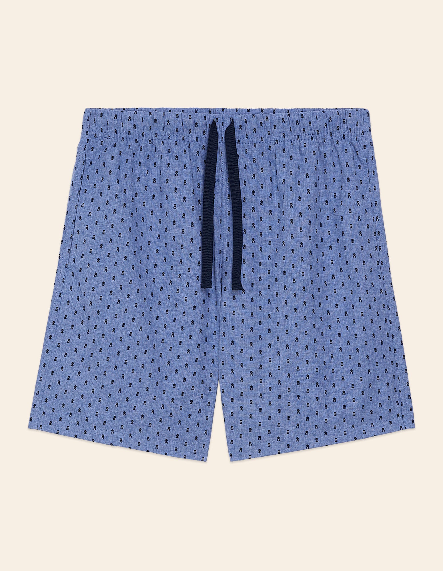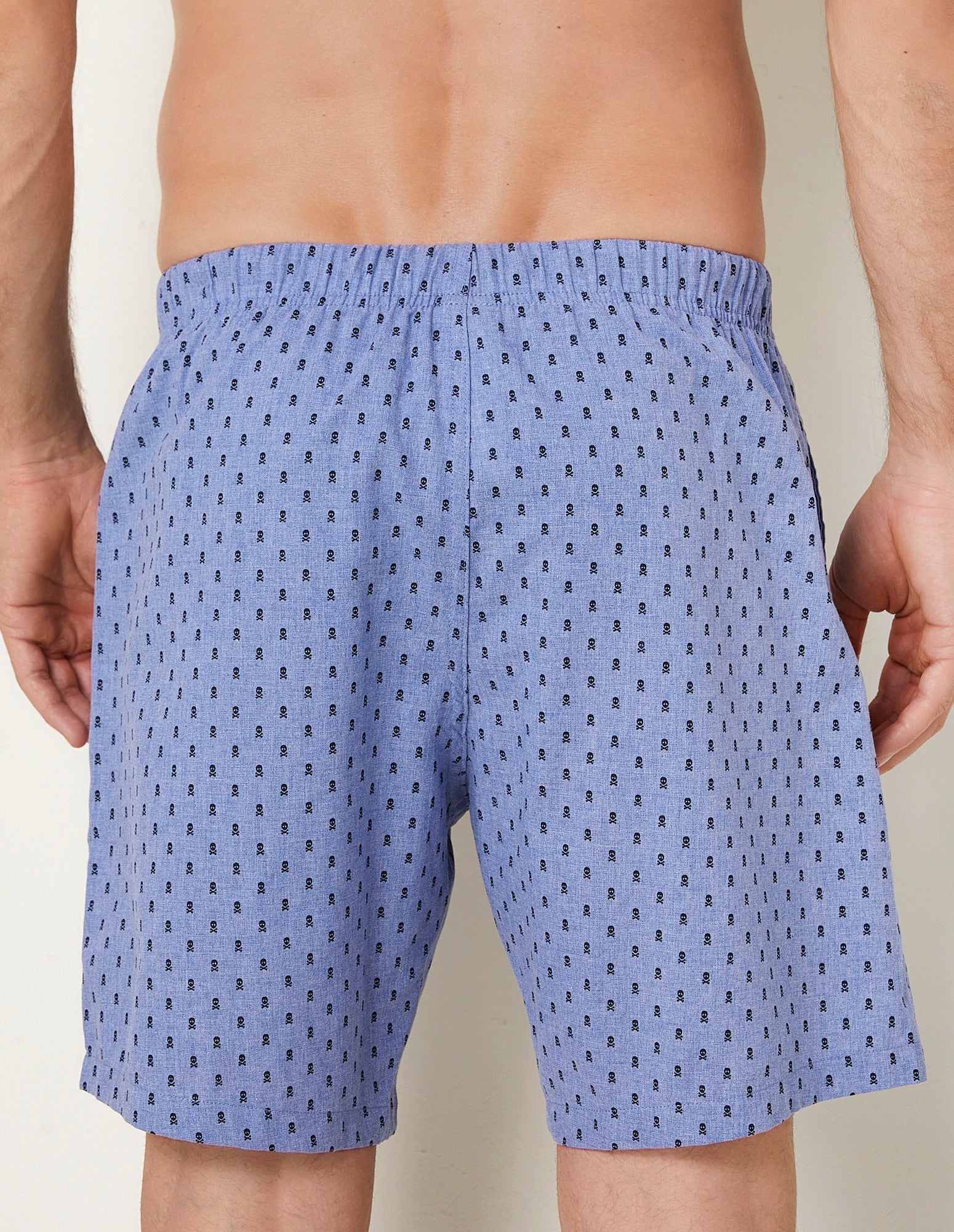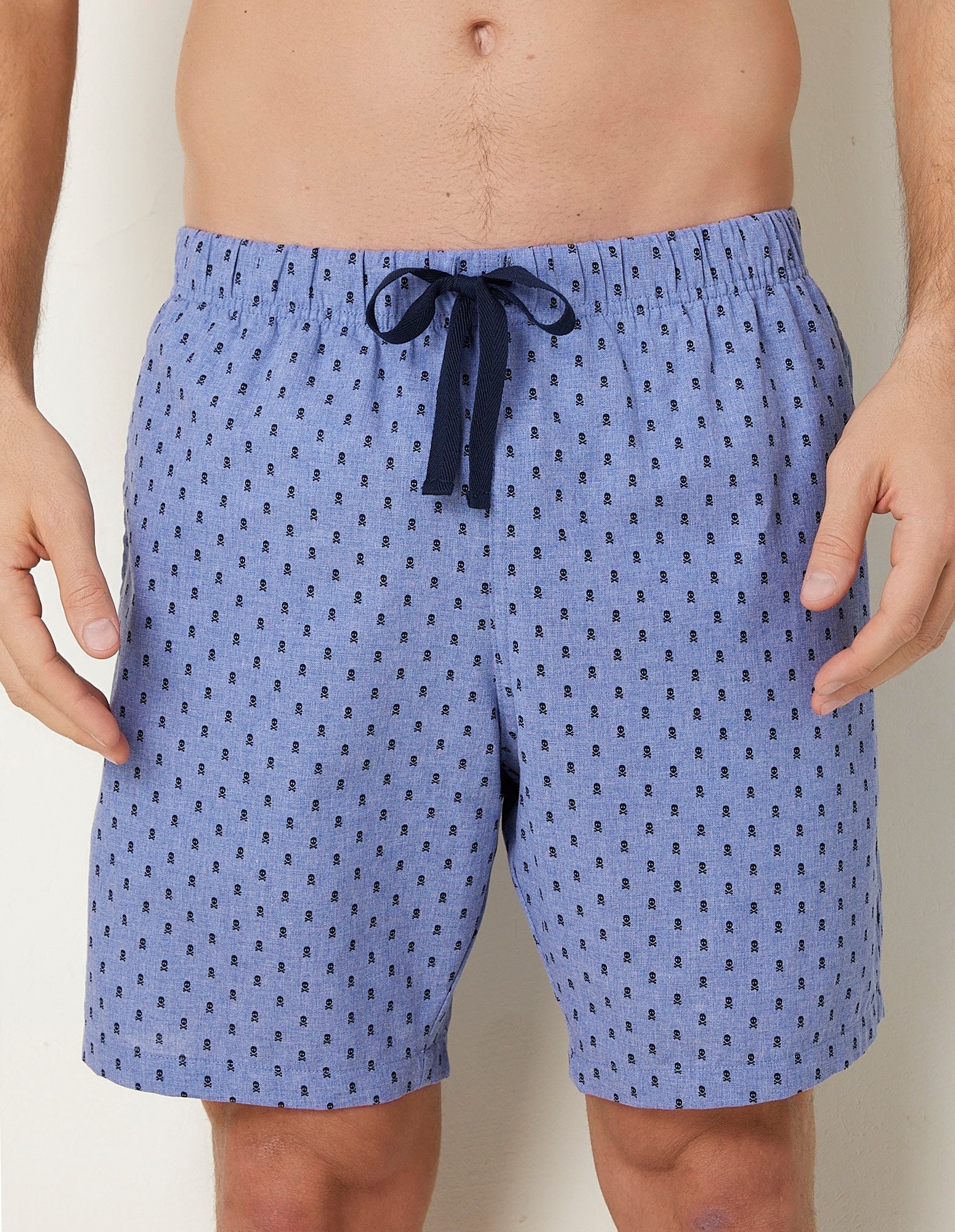 Bermuda homme bleu clair à imprimé tête de mort bleu foncé, idéal pour la détente, en pyjama ou par temps chaud. Confectionné en coton doux, il est doté de poches et d’une taille élastique avec cordon de serrage. En achetant ce vêtement, Yamamay contribue à la mission Better Cotton.