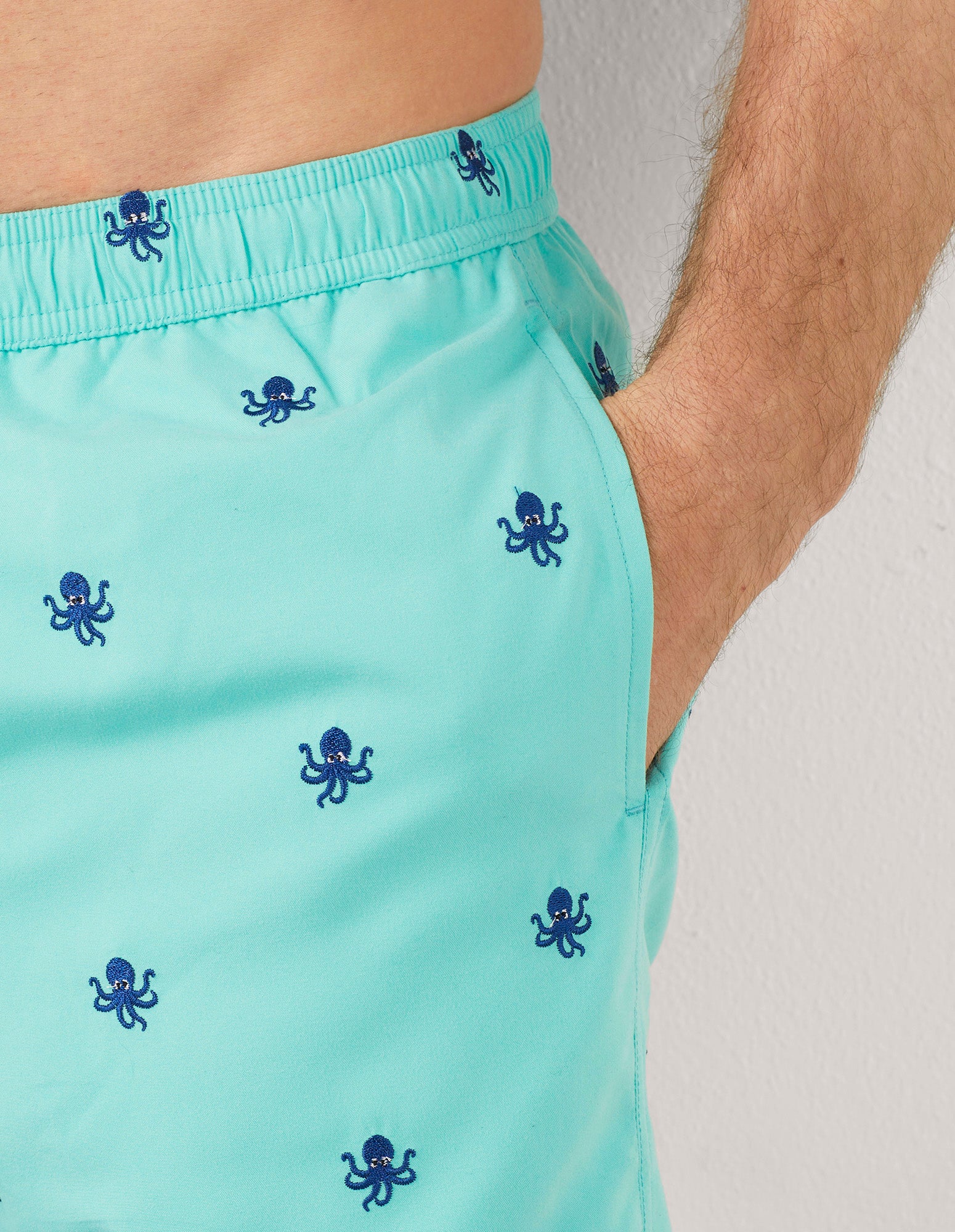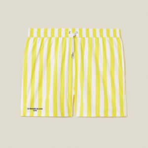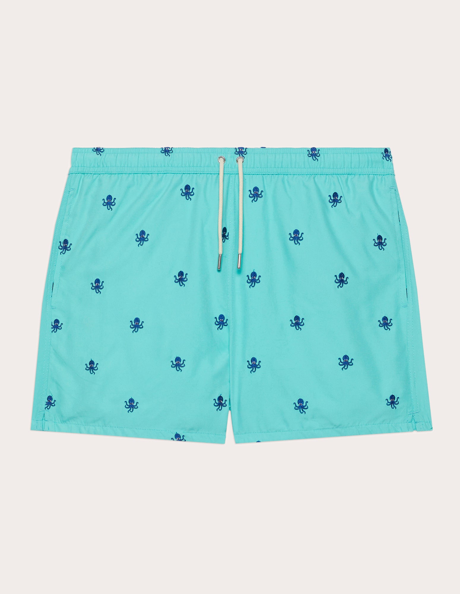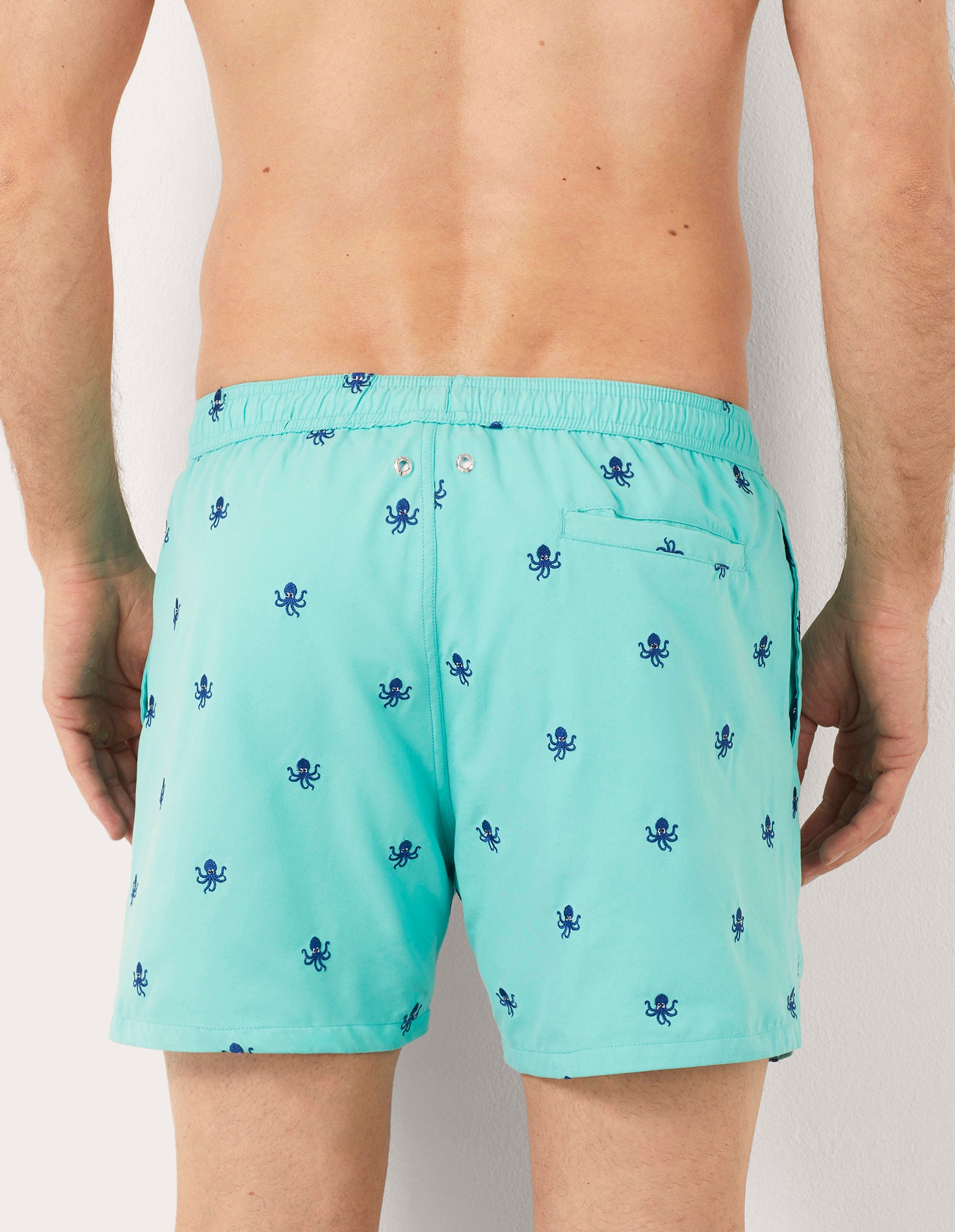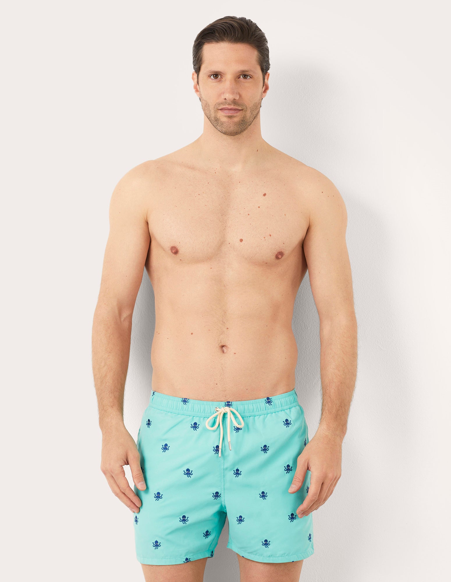 Boxer de bain mi-long pour homme en tissu léger à séchage rapide. Imprimé dans des tons bleu clair avec de petites étoiles de mer. Taille élastiquée avec cordon de serrage réglable, poches latérales et poche arrière.