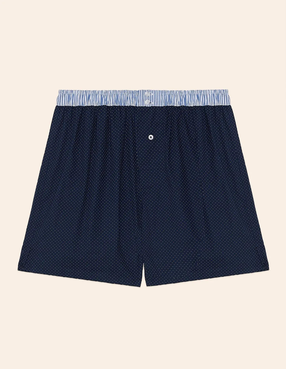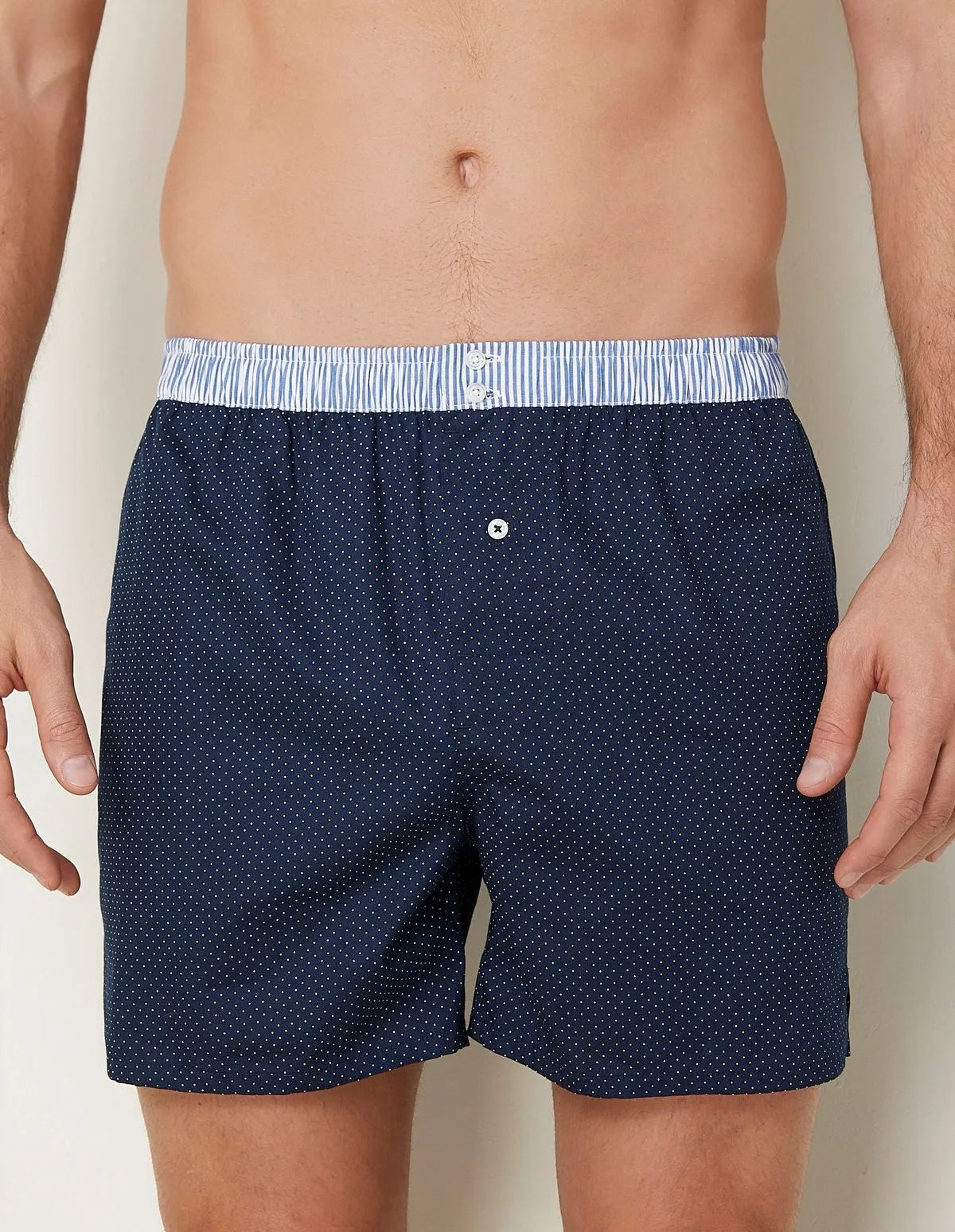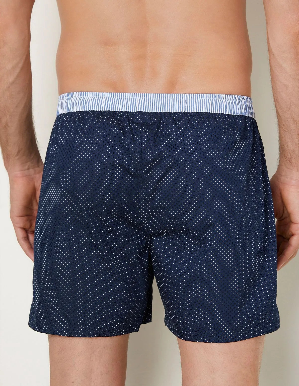Ce boxer allie confort et style. Fabriqué en toile de coton douce imprimée bleue à pois et doté d’une taille élastique à motif différent, il offre un maintien confortable et sûr tout au long de la journée., TISSU TEINTÉ EN FIL, 100 % CO.