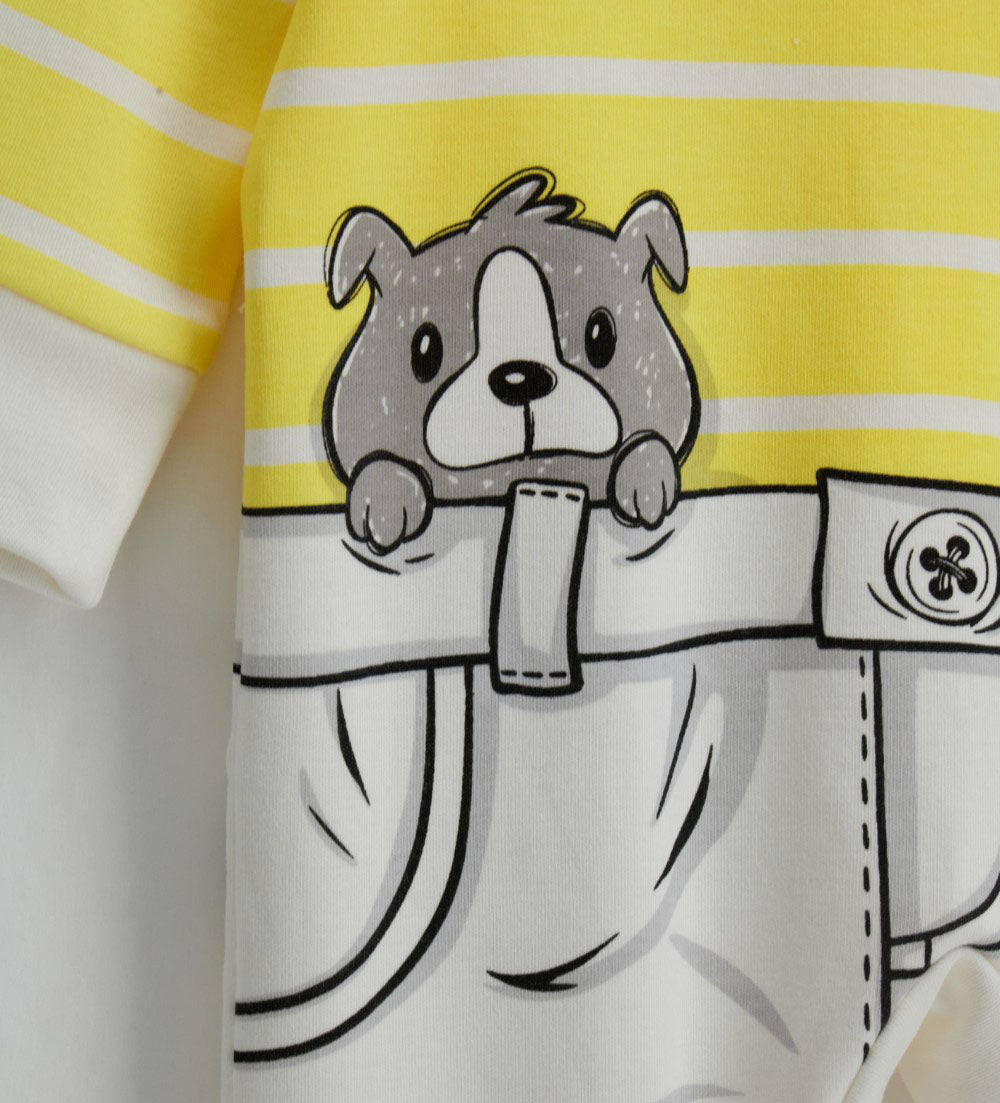 Barboteuse en coton doux avec col ras du cou, manches longues, ouverture à boutons-pression dans le dos et imprimé trompe l’oeil sur le devant, les pieds et le dos.