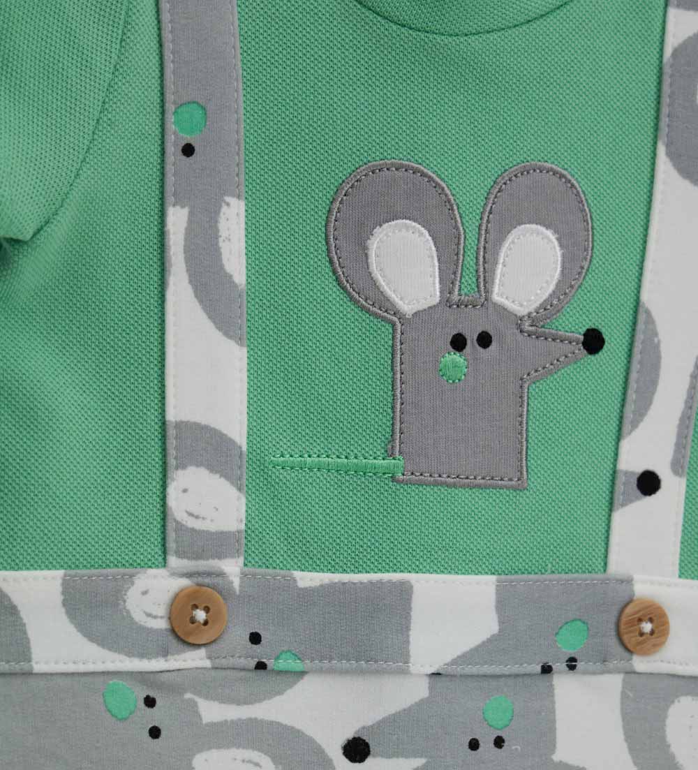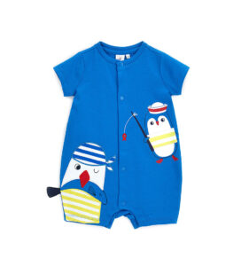 Combinaison trompe l’oeil en maille de coton piqué, col ras du cou, manches courtes avec salopette en coton sweat avec imprimé allover, ouverture par boutons pression au dos et à l’intérieur de la jambe et application de broderie sur le devant.
