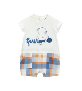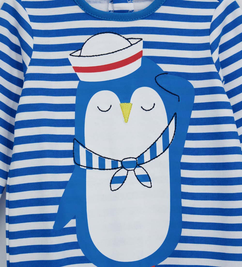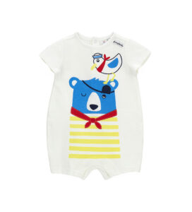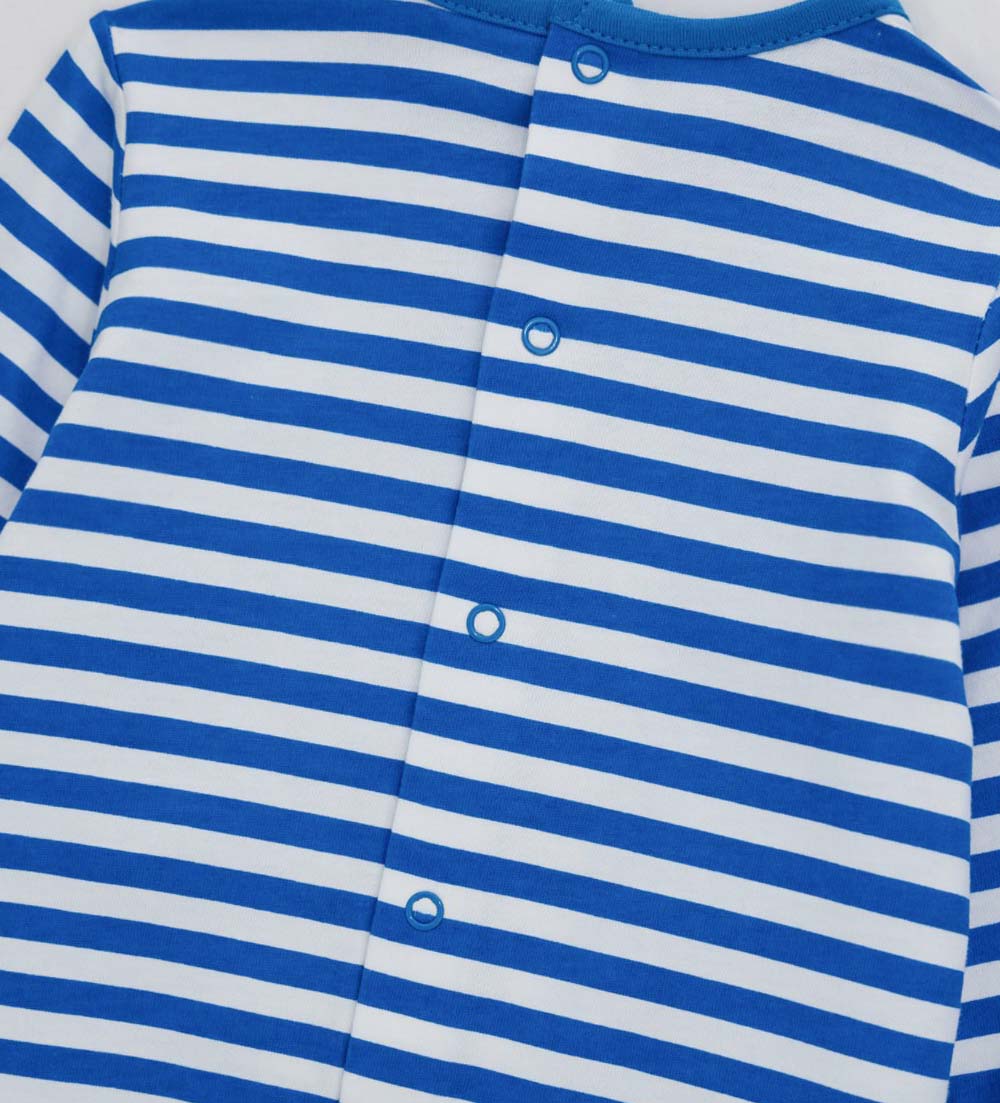 Combinaison en coton à col ras du cou, manches longues et imprimé rayé sur toute la surface, fermeture à boutons-pression dans le dos et à l’intérieur de la jambe, imprimé et appliqué brodé sur le devant.