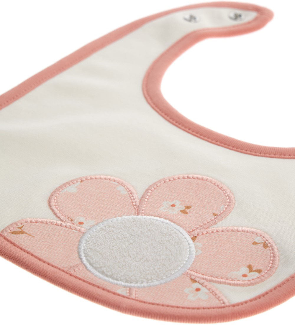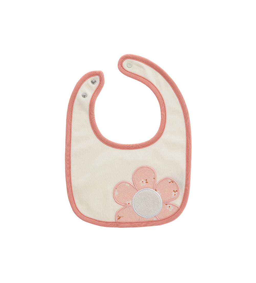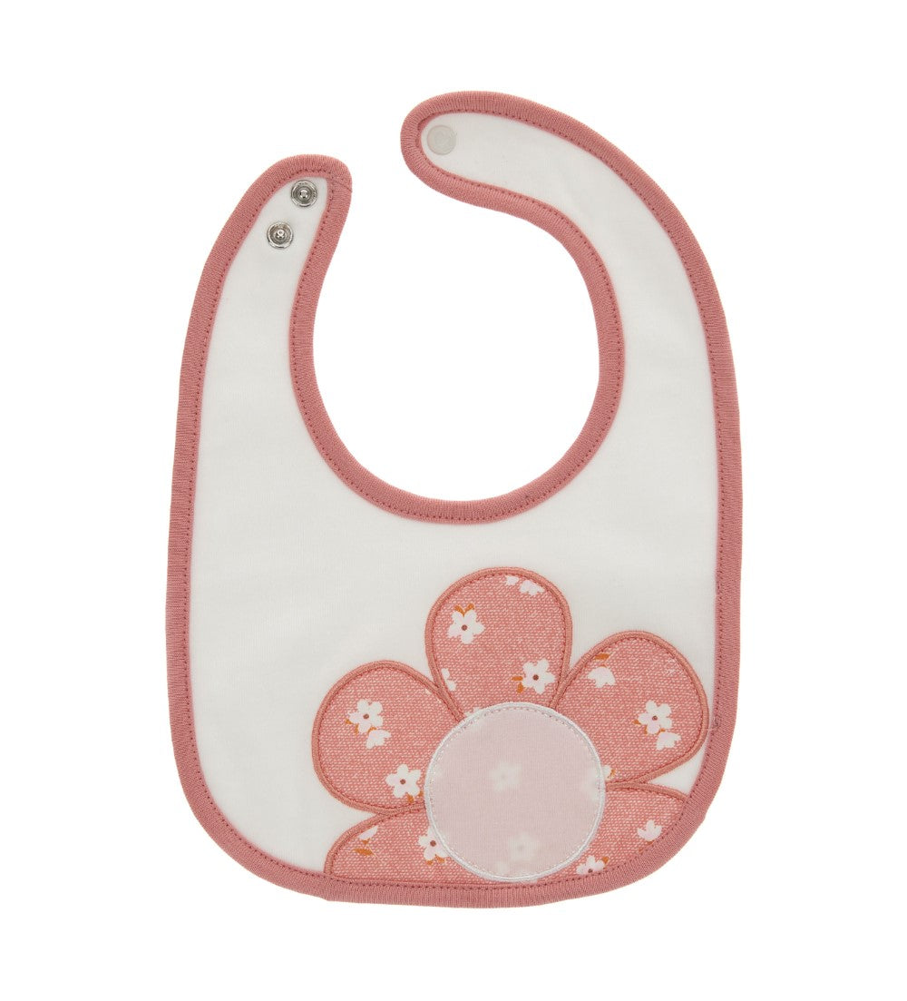 Bavoir en coton sur le devant et en éponge sur le dos avec ouverture réglable par bouton pression, imprimé et broderie sur le devant.