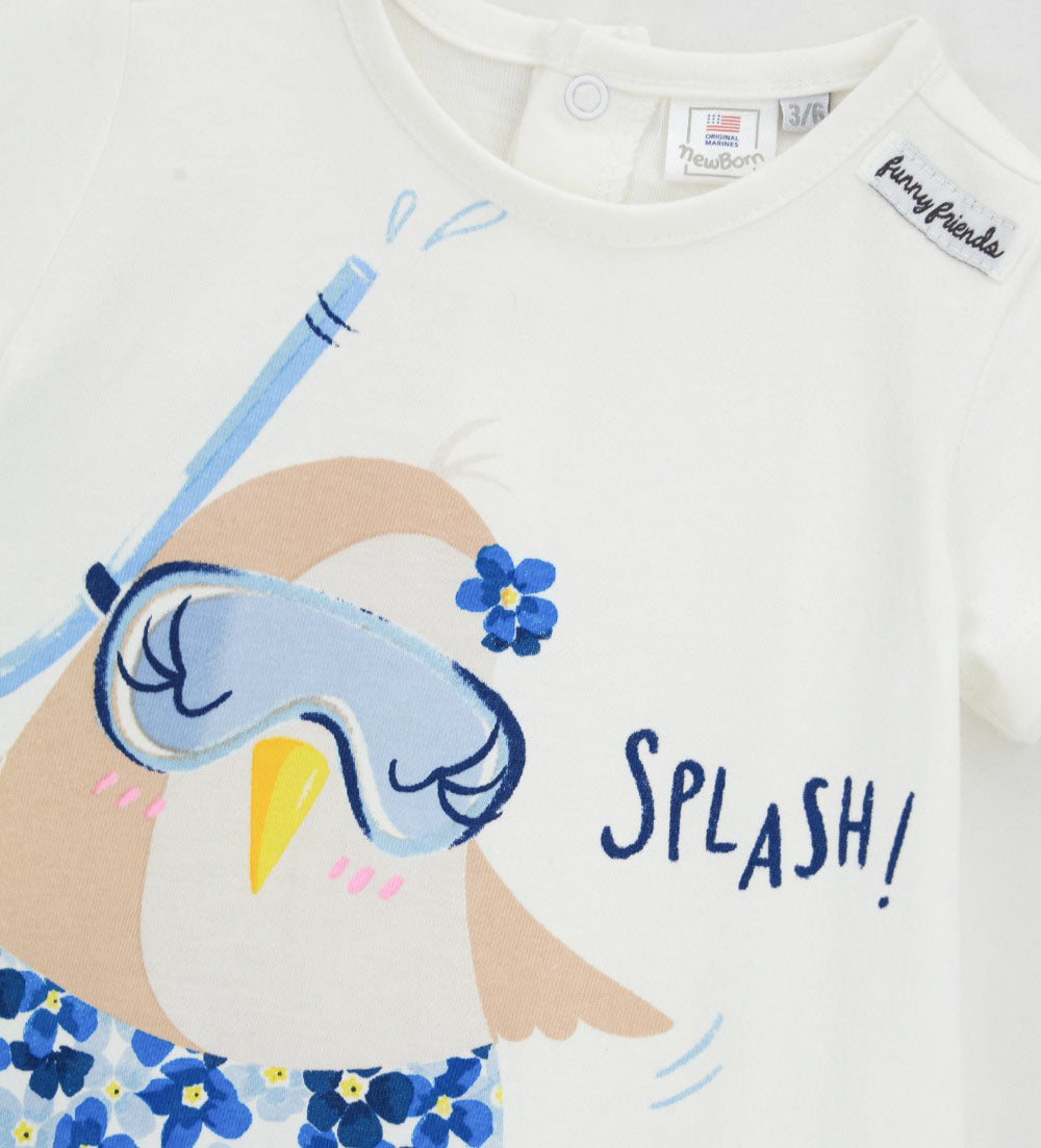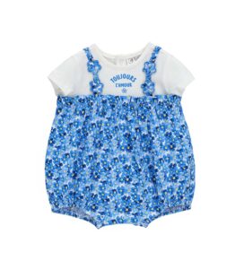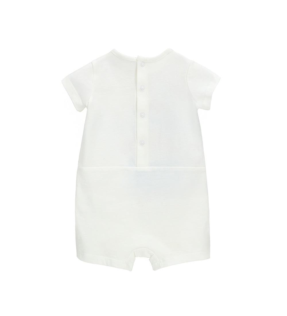 Combinaison en coton avec col ras du cou, manches courtes, ouverture par bouton-pression au dos et à l’intérieur de la jambe, imprimé sur le devant et étiquette tissée sur l’épaule.